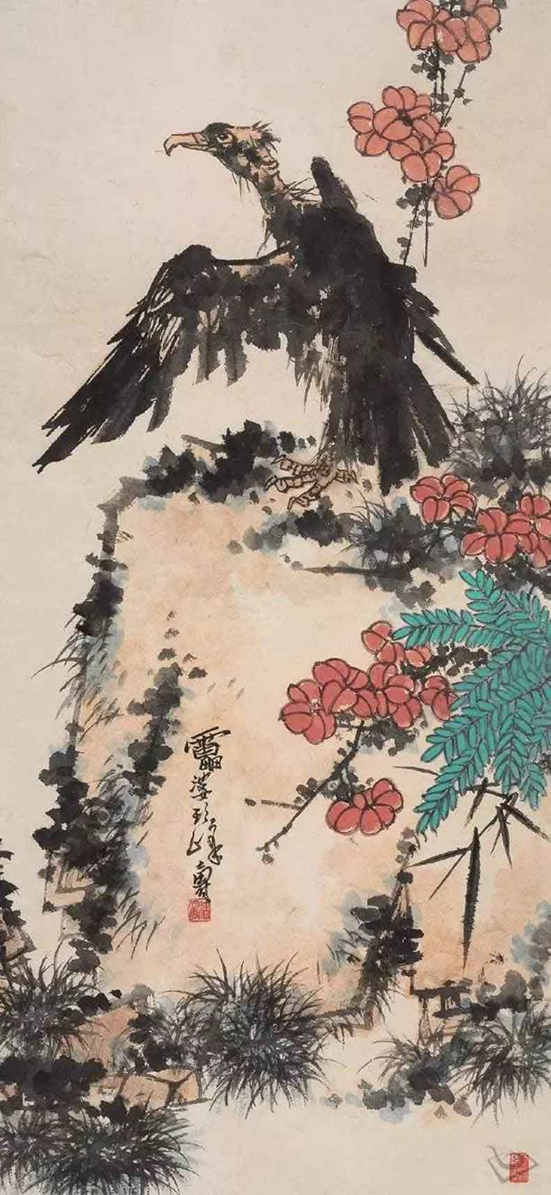 106 潘天寿笔下的鹰鹫图,一味霸悍! 潘天寿是现代中国画史上举足轻重的人物。他运笔果断强劲,主张“强其骨”、“一味霸悍”。作品善从高、远、大处立意,以苔台贯通气脉,深得劲拨阳刚之美。潘天寿精于写意花鸟和山水,偶作人物。尤善画鹰鹫、八哥、蔬.. 4个月前