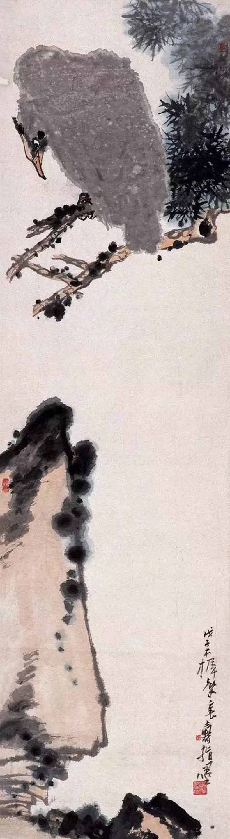 114 潘天寿山水画欣赏 潘天寿,中国近代国画大师,在中国近代山水画史上是一位“传统出新”的典范。潘天寿的山水画博采众长,尤于石涛、八大、吴昌硕诸家中用宏取精,形成个人独特风格,仅笔墨苍古、凝炼老辣,而且大气磅礴,雄浑奇崛,具.. 3个月前