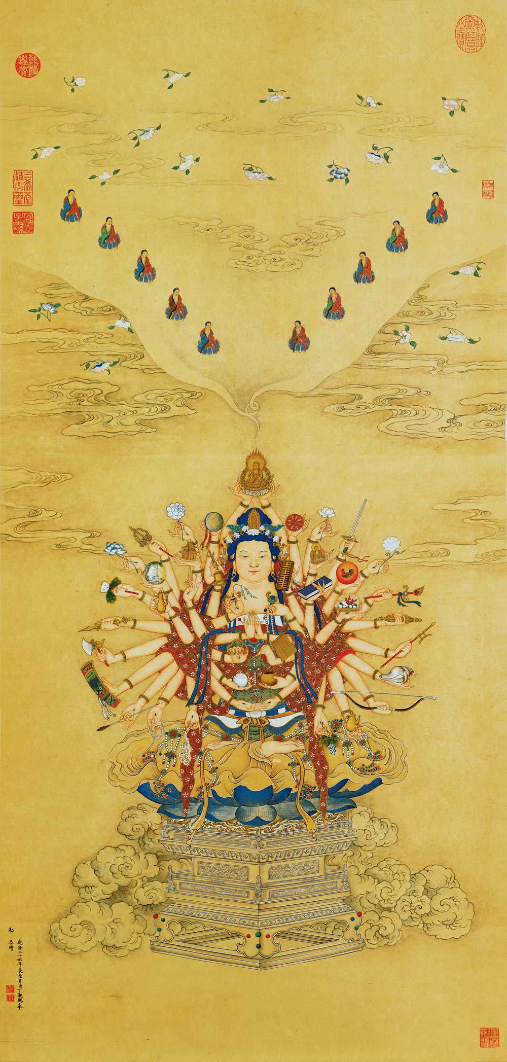 723 丁观鹏《宝相观音》欣赏 清代丁观鹏所绘的宝相观音图。图绘千手宝相观音一尊,各手分别持小斧、莲花、宝剑、弓箭等各种法宝;头上祥云朵朵飘荡,云中托出小佛十尊,花朵飞扬。观音面容和手臂作多层烘托,有较强的立体质感。说明作者在继承传.. 2024-07-22 08:21