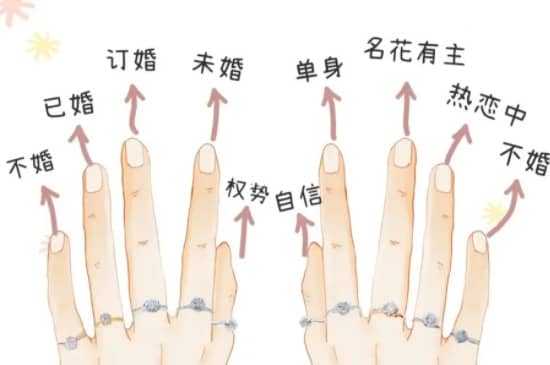 254 戒指的含义与戴法 大拇指,大拇指戴戒指用于表示自己的身价地位;食指,戒指戴左食指表示未婚,戴右食指表示单身;中指,戒指戴左中指表示订婚,戴右中指表示恋爱;无名指,戒指戴左无名指表示已婚,戴右无名指表示热恋;小拇指,戒指.. 7个月前