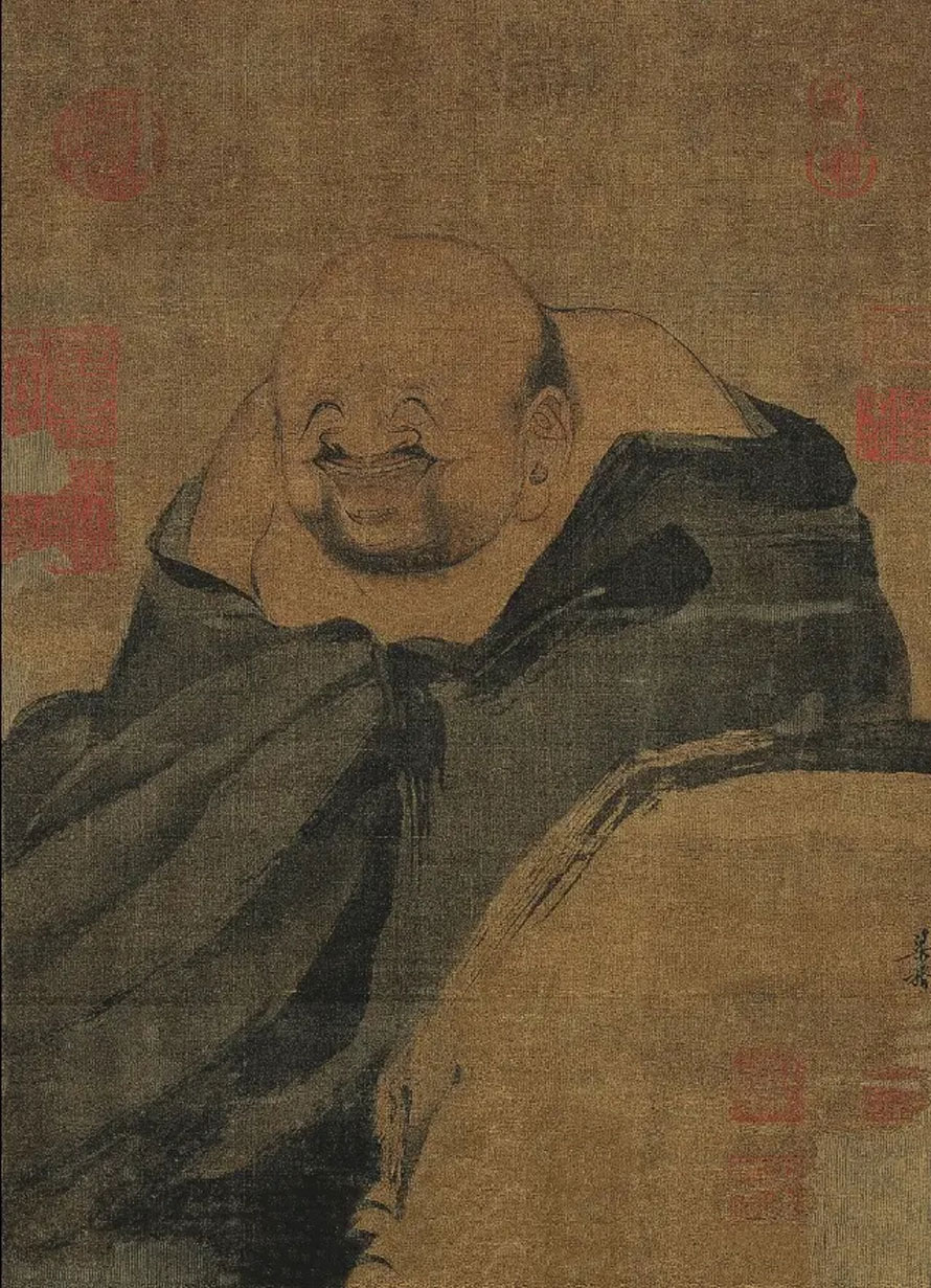 443 梁楷《布袋和尚图》欣赏 《布袋和尚图》是南宋画家梁楷所画的一幅中国画。从画面构图来看,梁楷运用了简练的线条和淡雅的墨色,勾勒出了布袋和尚的形象。画中的布袋和尚面带微笑,眼神慈祥,身姿洒脱,给人一种超然物外的感觉。这种构图方式.. 2024-07-19 08:12