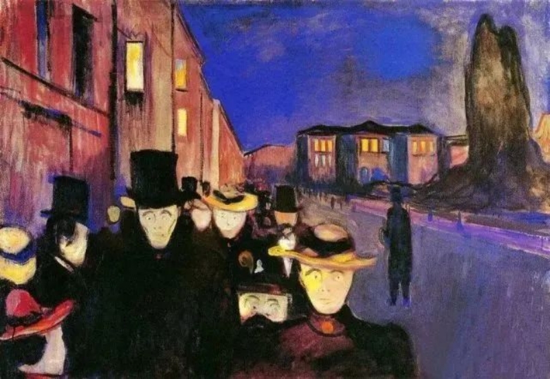 421 蒙克《卡尔约翰街的夜晚》欣赏 《卡尔约翰街的夜晚》是蒙克的代表作品之一,也是其画风转向表现主义的起点。此画与《呐喊》有异曲同工之处,都给观众一种强烈的压抑、恐怖和窒息感受,有典型的表现主义特征。画面描绘的是奥斯陆市繁华的卡尔约翰大.. 2024-10-15 08:19