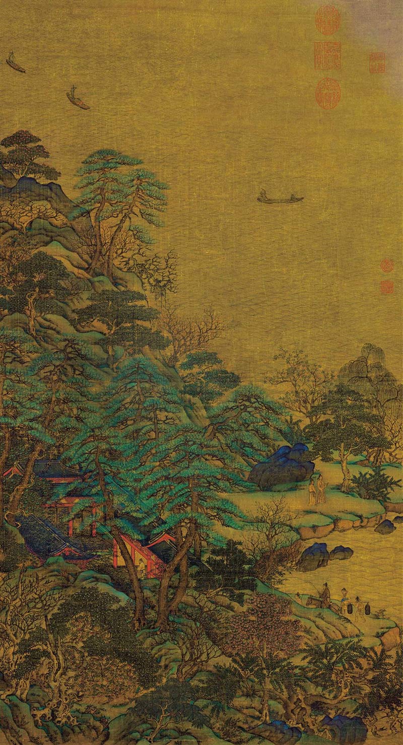 353 李思训《江帆楼阁图》欣赏 李思训(653—718年),唐代书画家,字建,一作建景,今甘肃天水人。宗室,唐高宗李治时任江都令。工书法,尤擅画山水树石,笔力遒劲,格调细密。朱景玄说他“国朝山水第一,列神品”。元代汤厚也说:“李思训画著色.. 2024-11-11 08:21