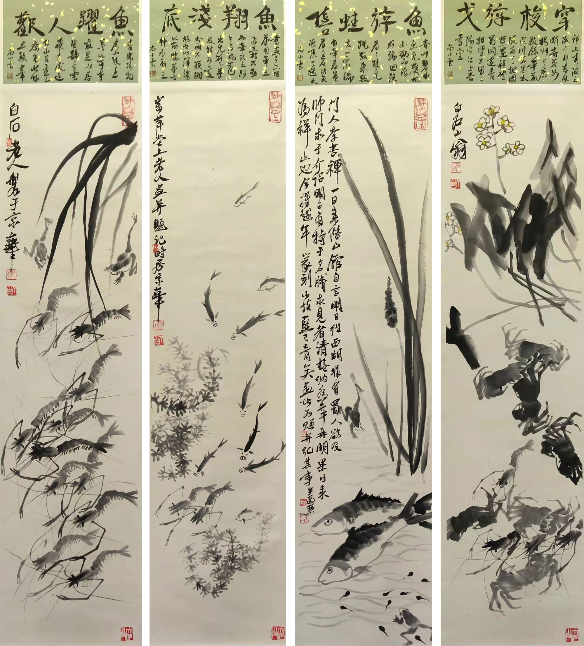 407 齐白石《水族四条屏》,集大成之作 齐白石笔下的水墨虾蟹虫鱼,形神兼备又得笔墨之趣,开拓了中国意笔写实型水墨一路。齐白石笔下的水族画很是精妙有趣,有着“草野之狸,云天之鹅,水边雏鸡”奈何不得的自在和生动。齐白石所画的水族之趣,还有他所企.. 2024-09-03 08:06