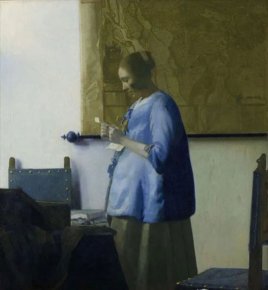 433 维米尔《读信的蓝衣女子》欣赏 《读信的蓝衣女子》被誉为维米尔最美的作品之一,展示了维米尔对于色彩、光线和透视的卓越掌控力。一名身穿蓝色外套的年轻女子正全神贯注地读信。画中以相对大面积的直角区块来分割画面,并采用平静的蓝色和土黄色色.. 2024-07-31 08:26