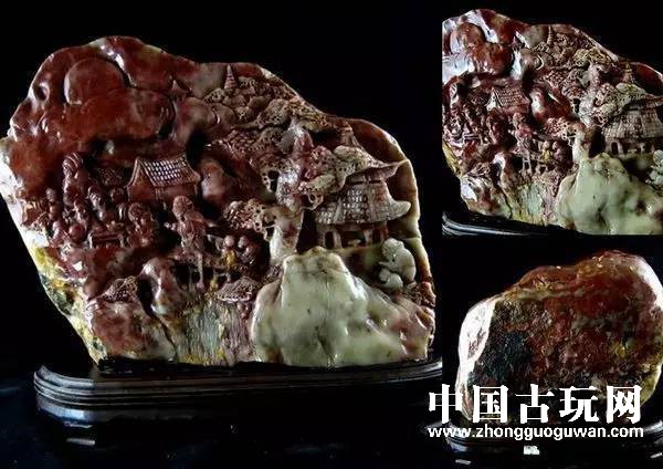 8.杂色独山玉:在同一块标本或成品上常表现为上述两种或两种以上的颜色,特别是在一些较大的独山玉原料或雕件上常出现四至五种或更多颜色品种,如绿、白、褐、青、墨等多种颜色相互呈浸染状或渐变过渡状存于同一块体上,甚至在不足1厘米的界面上亦会出现褐、绿、白三色并存,这种复杂的颜色组合及分布特征对独山玉的鉴别具有重要的指导意义。杂色独山玉是独山玉中最常见的品种,占整个储量的50%以上。