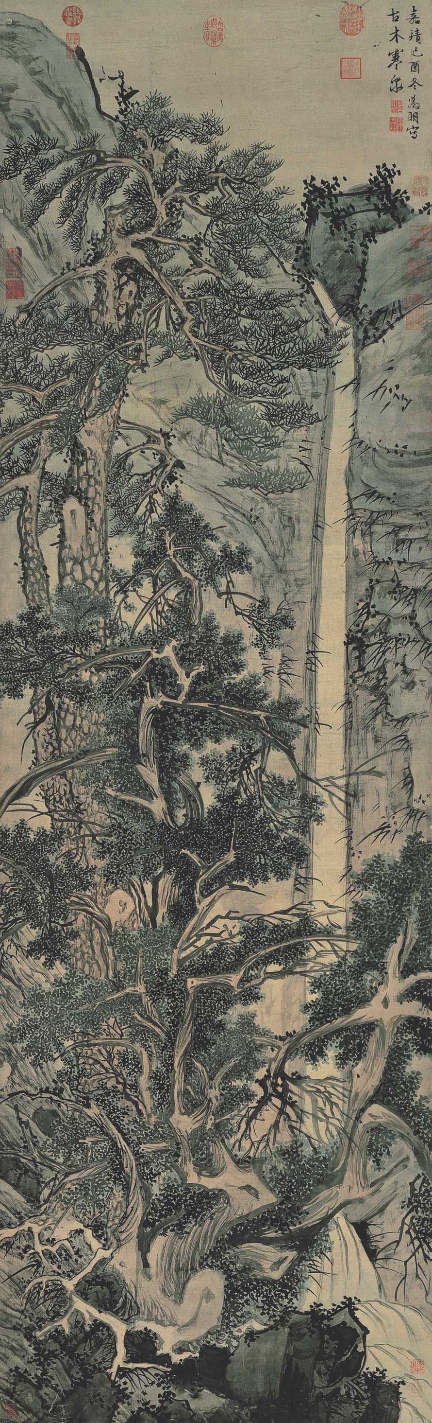 此帧作于嘉靖己酉(1549)冬日,为文氏八十高龄所绘,而经力充沛,神气十足,笔墨纵逸,深雄险峻,是文征明粗笔画作中极精之品。一松一柏,相旁而生。柏树老干分披,杈枒四出;其后松树两干并伸,参云直上。背景石壁与松柏紧贴,塞地漫天,几无余地,忽于绝高处界出飞泉一道,数折而下,遂使通幅于紧迫繁复之中,遽尔空灵疏朗,确为神来之笔。