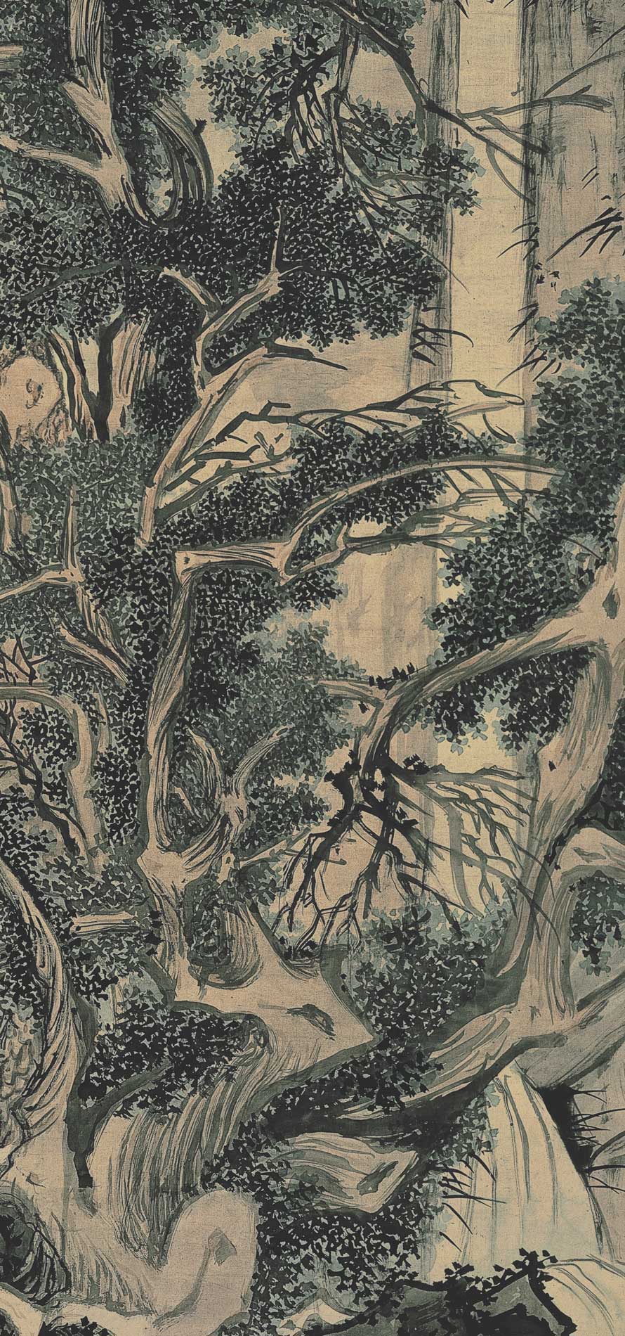 《古木寒泉图》中,一棵松树及一棵柏树依靠着生长,柏树的枝干张牙舞爪、松树则两干并伸,直上云霄。背景的石壁跟两树紧贴着,几乎都没有留白的地方,最高处飞泄出一道瀑布,使繁复的画面顿时清爽起来,相当高明。