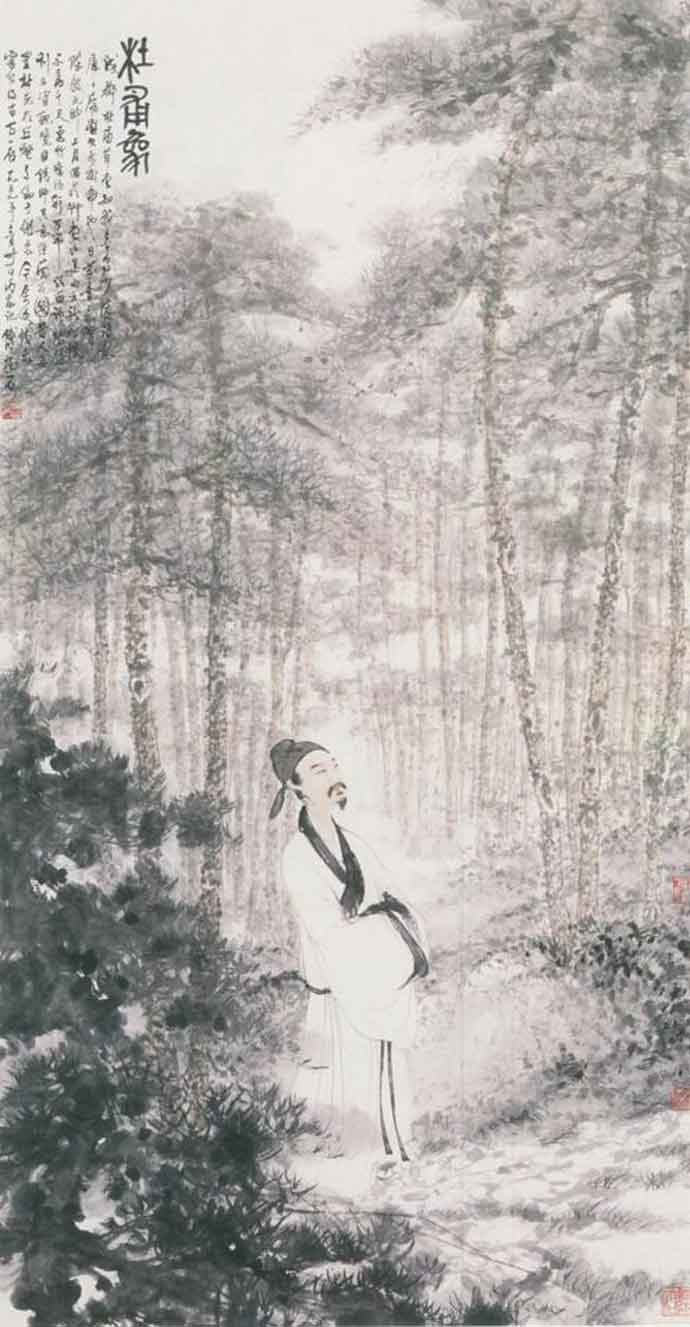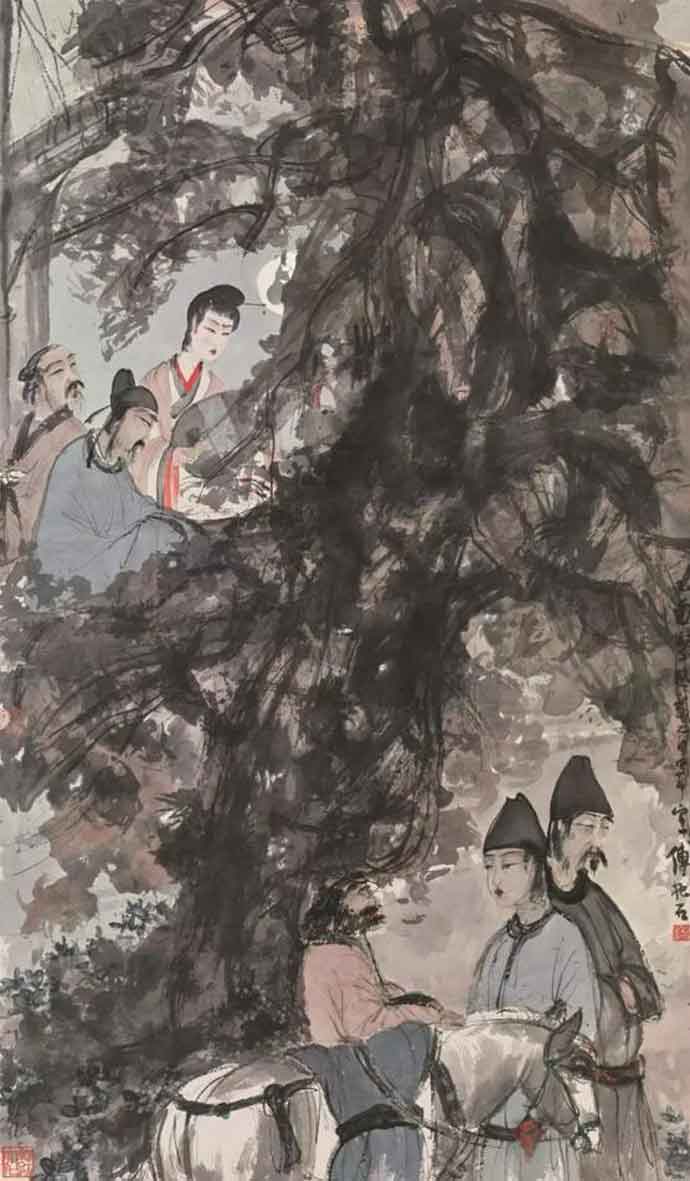 在中国文化语境中,松树因长青不老、高耸入云而被赋予特定的精神意义,象征品行高洁的高士,在历代绘画中均有所表现。而唐代中叶爆发安史之乱,杜甫避走巴蜀的经历,恰与20世纪中国艺坛借古开今的大家傅抱石于抗战时期的人生际遇颇为相似,故少陵诗意对其产生浓厚的共鸣,名作《丽人行》、《即从巴峡穿巫峡》均源生于此。而影响其至深的好友郭沫若亦曾明确期望画家以杜甫为精神追求,认为杜甫关注民间疾苦,感情丰沛而分明,是画家所追求的理想人格。