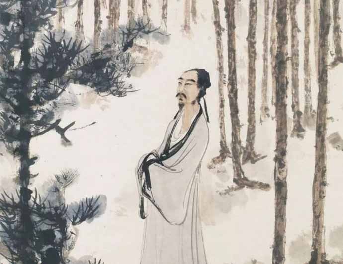 细鉴此作,傅抱石题以杜甫诗句“新松不恨高千尺,恶竹应须斩万竿”,而松林中微微抬头仰望松林的高士形象,无疑是唐代伟大诗人杜甫。此与现藏南京博物院之《杜甫象》之构图相近,相信是出于同一题材。