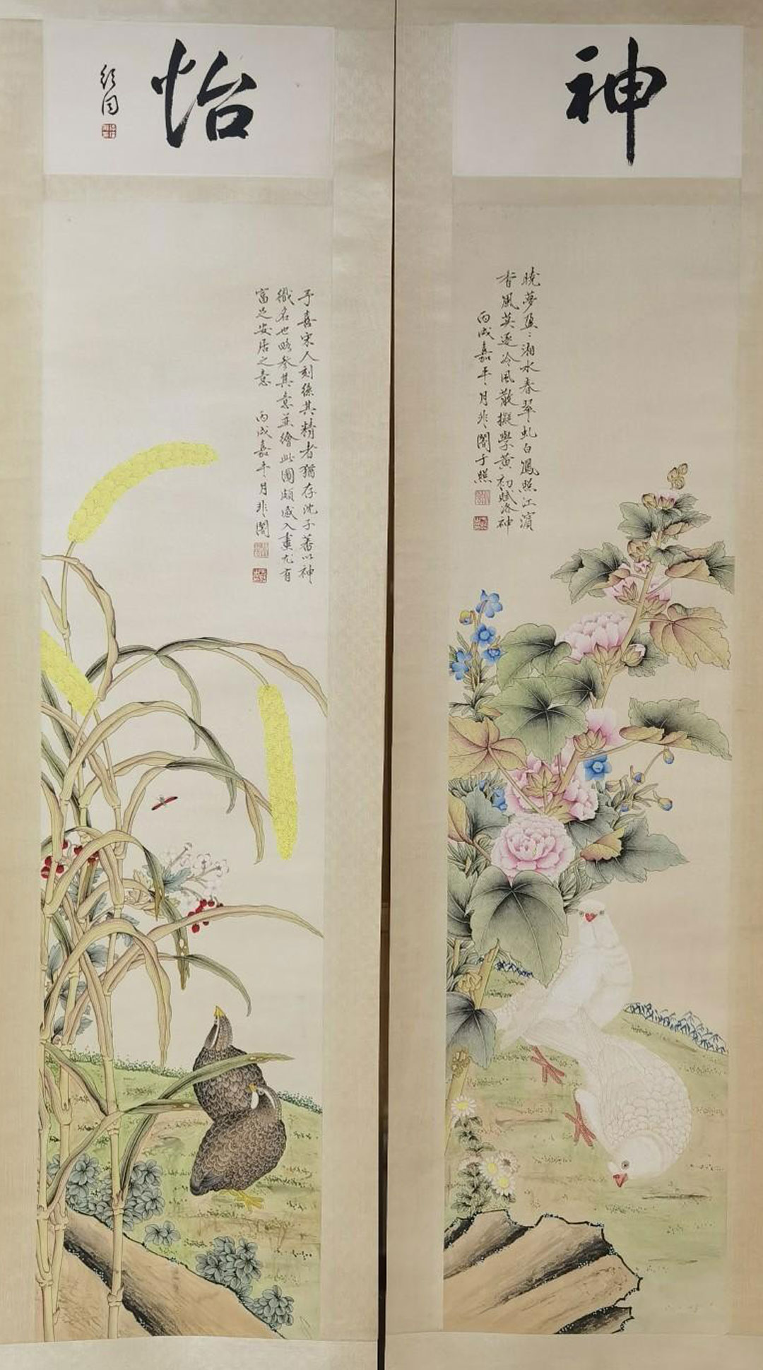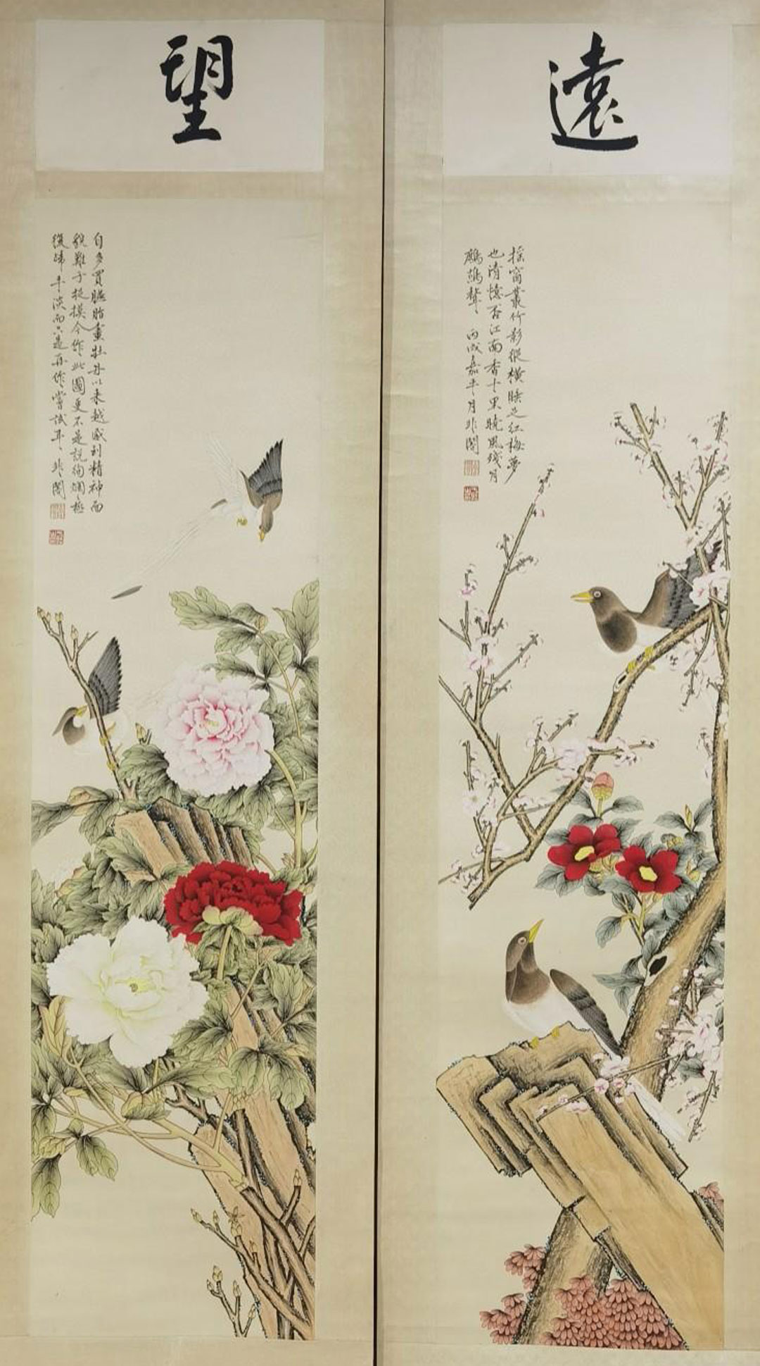 于非闇的绘画从民间缂丝技法的默写传神,两面晕染等方法中获得许多启发, 其作品中艳丽的设色、朴实的作风以及章法、取材等都深受缂丝艺术的影响。此条屏拟宋代沈子蕃缂丝法,气派瑰丽堂皇,富装饰味道,颇具丝织品的质感。但色取沉实,不沦浓艳。花卉、双鸟等俱清丽之色细绘,令画面色调轻重浓淡搭配得宜,在装饰意味中复见自然真态,难怪画家题款为“略参其意并绘此图,颇感入画”。实为近现代运用缂丝效果于绘画之中的出色继承者和发扬人!