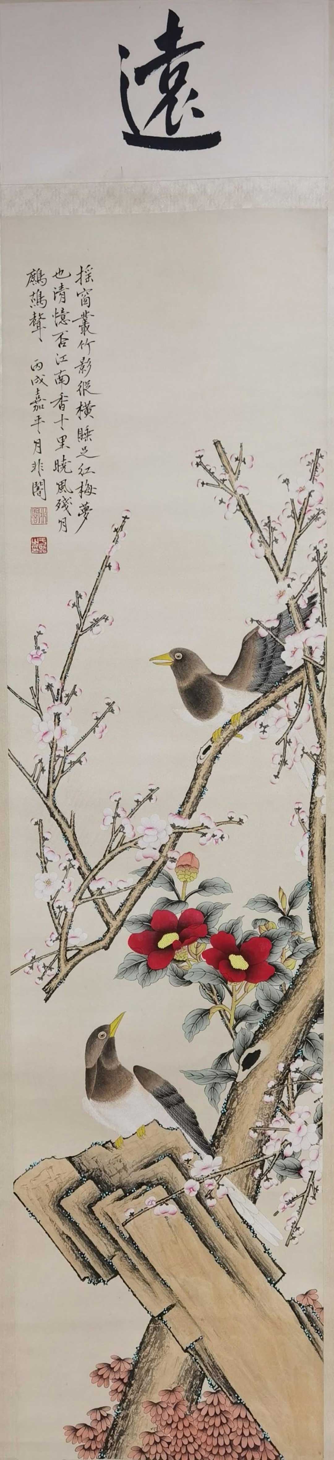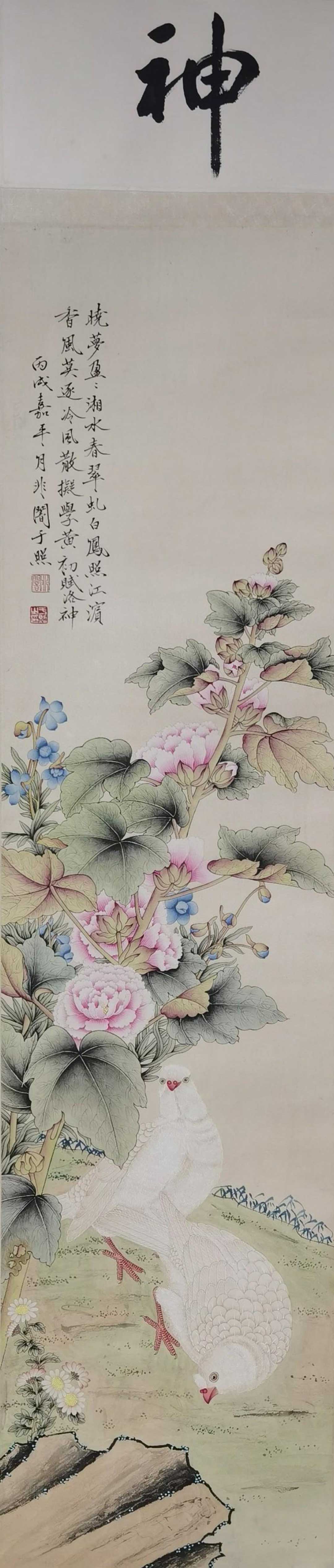 遥窗叢竹影纵横,睡足红梅梦也清。憶否江南香十里,晓风残月鹧鸪聲。丙戌嘉平月非闇。自多买胭脂画牡丹以来,越感到精神面貌难于捉摸,今作此图更不是说绚烂之极,复归平淡而只是再作尝试耳。非闇。晓梦盈盈湘水春,翠虬白凤照江滨。香风莫逐冷风散,拟学黄初赋洛神。 丙戌嘉平月非闇。予喜宋人刻丝,其精者犹存,沈子蕃以神织名也。略参其意并绘此图,颇感入画,尤有富足安居之意。丙戌嘉平月非闇。【钤印】非闇(朱)、于照之印(白)
