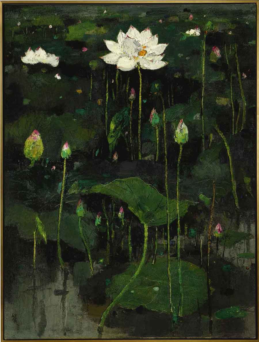 3、吴冠中《荷花(一)》布面油画