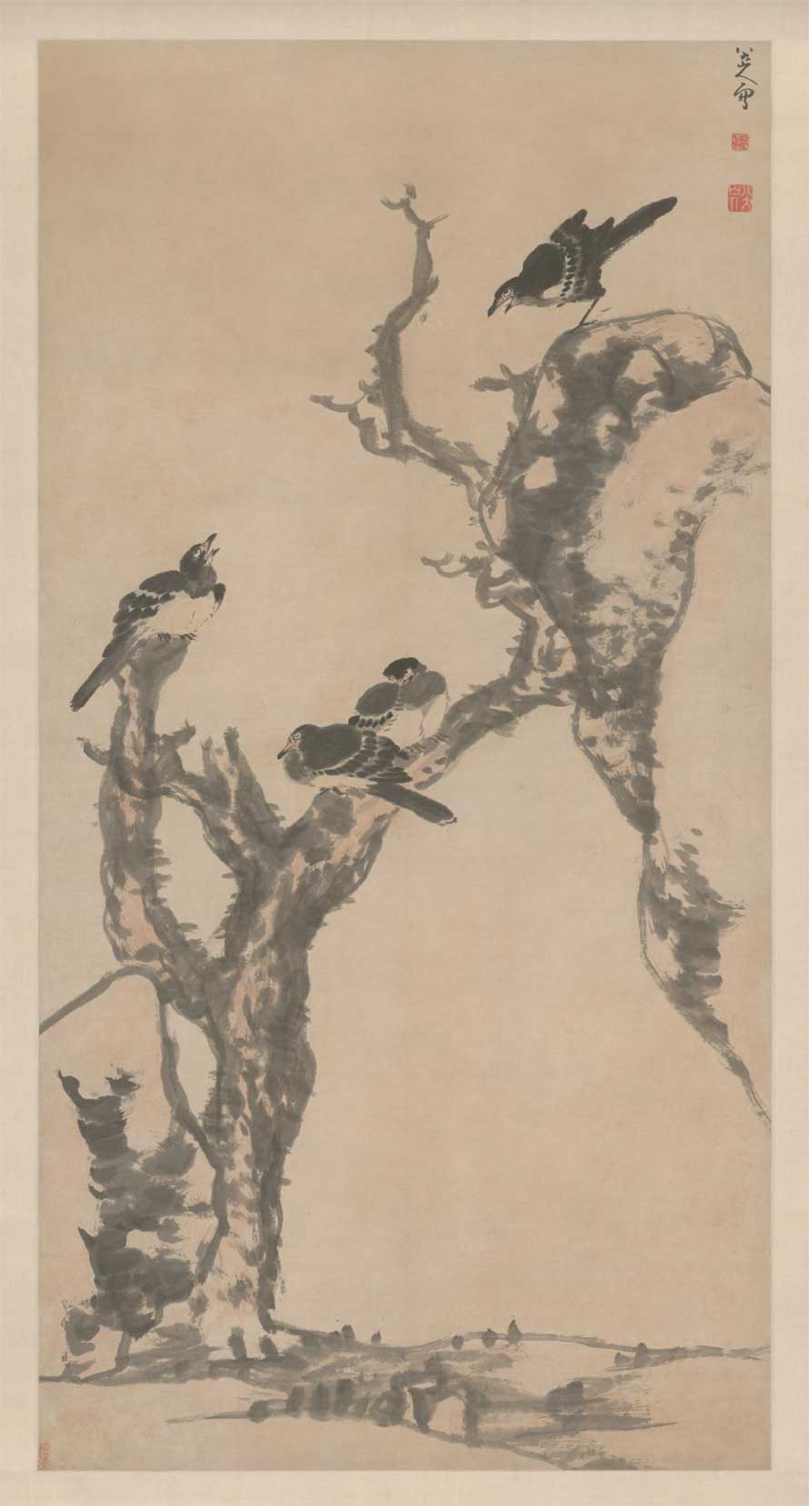 本幅表现隆冬时节,4只落寞的寒鸦在残石败枝上栖息的情景。寒鸦的羽毛先以淡墨晕染,趁湿在淡墨上罩以浓墨,浓淡墨交融处显现出羽毛柔软、细密的质感。鸟的眼眶为一笔圈成的椭圆形,靠近上眼眶处以重墨点睛,一付“白眼向人”的神色顿现笔底。鸟儿孤傲不驯的神态最能体现作者坚韧倔强、磊落不羁的个性。