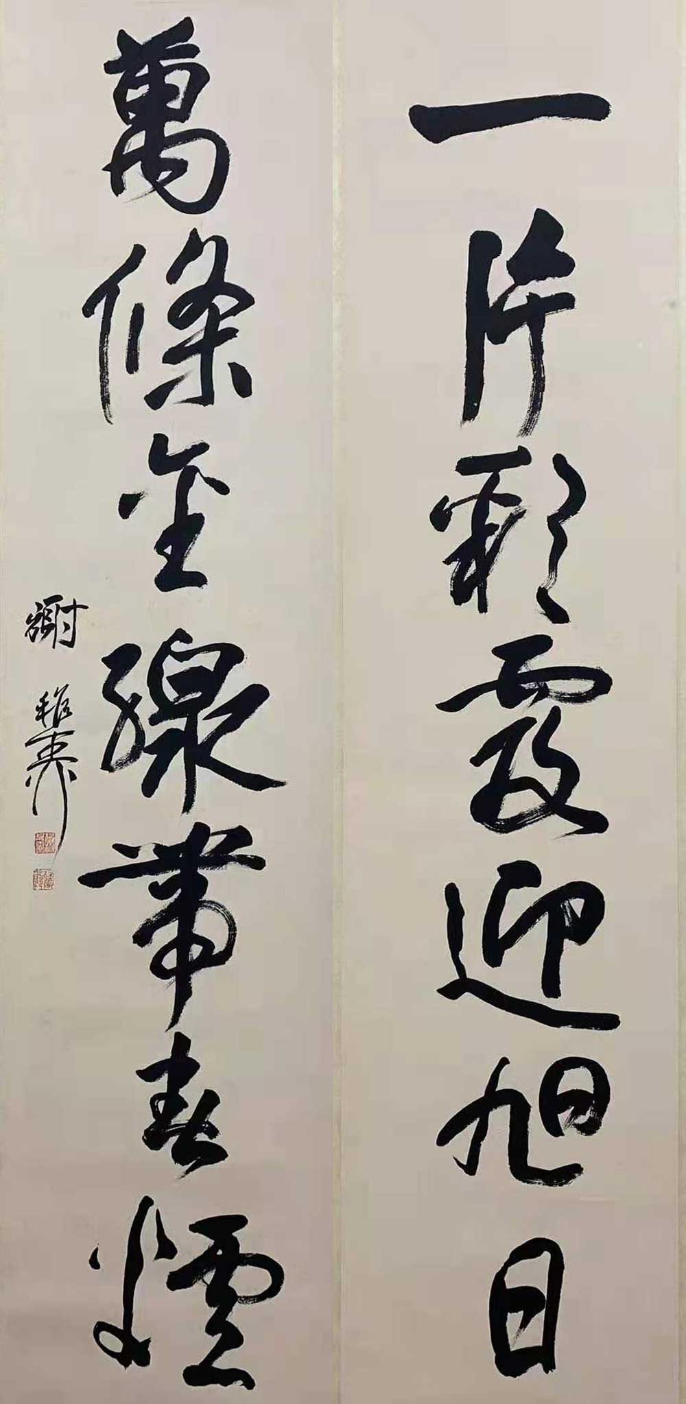 【对联】一片彩霞迎旭日,万条金线带春烟。谢稚柳。钤印:谢稚之印(白文)、壮暮翁(朱文)