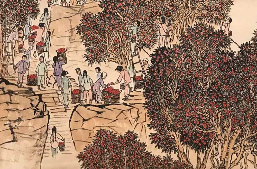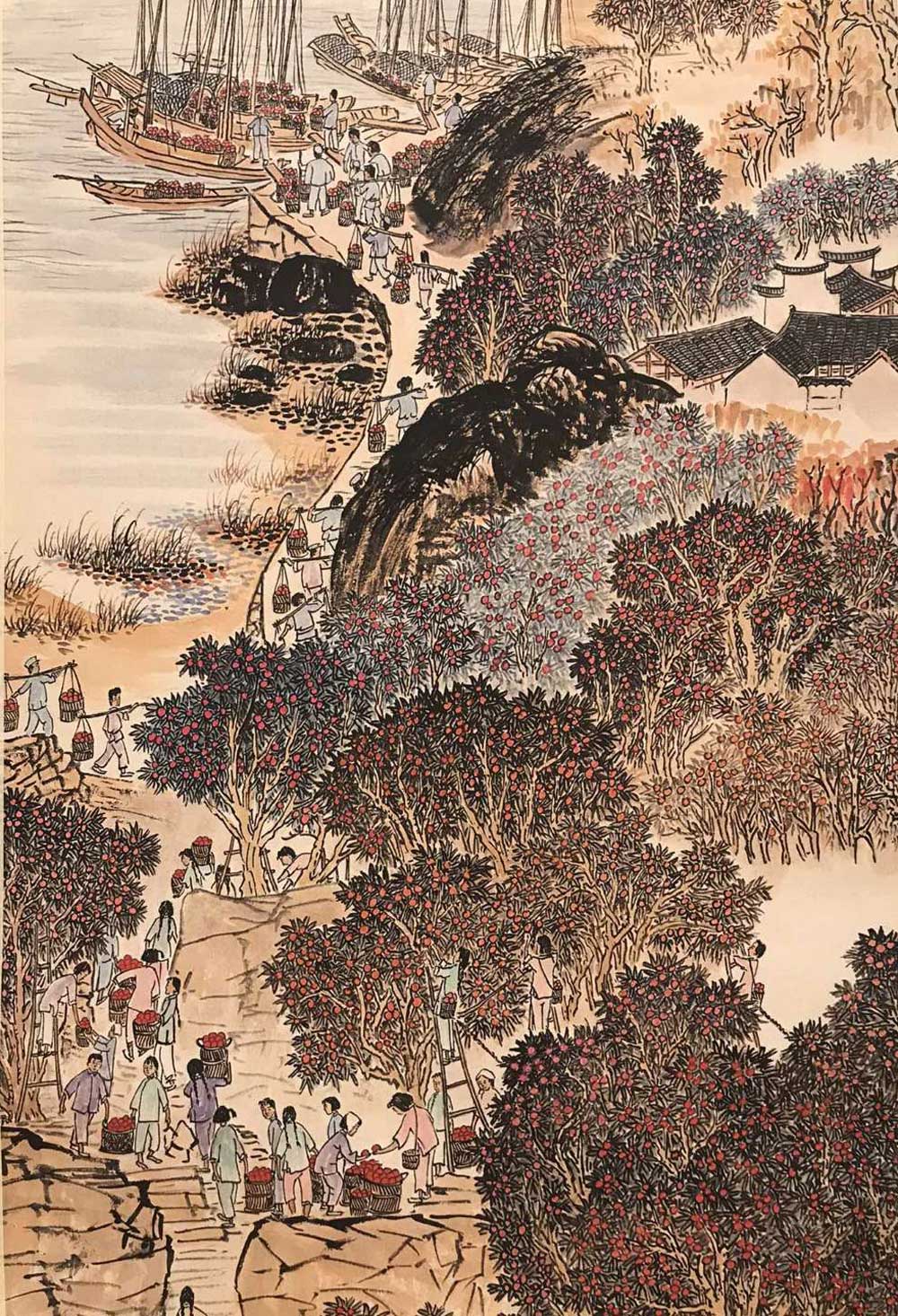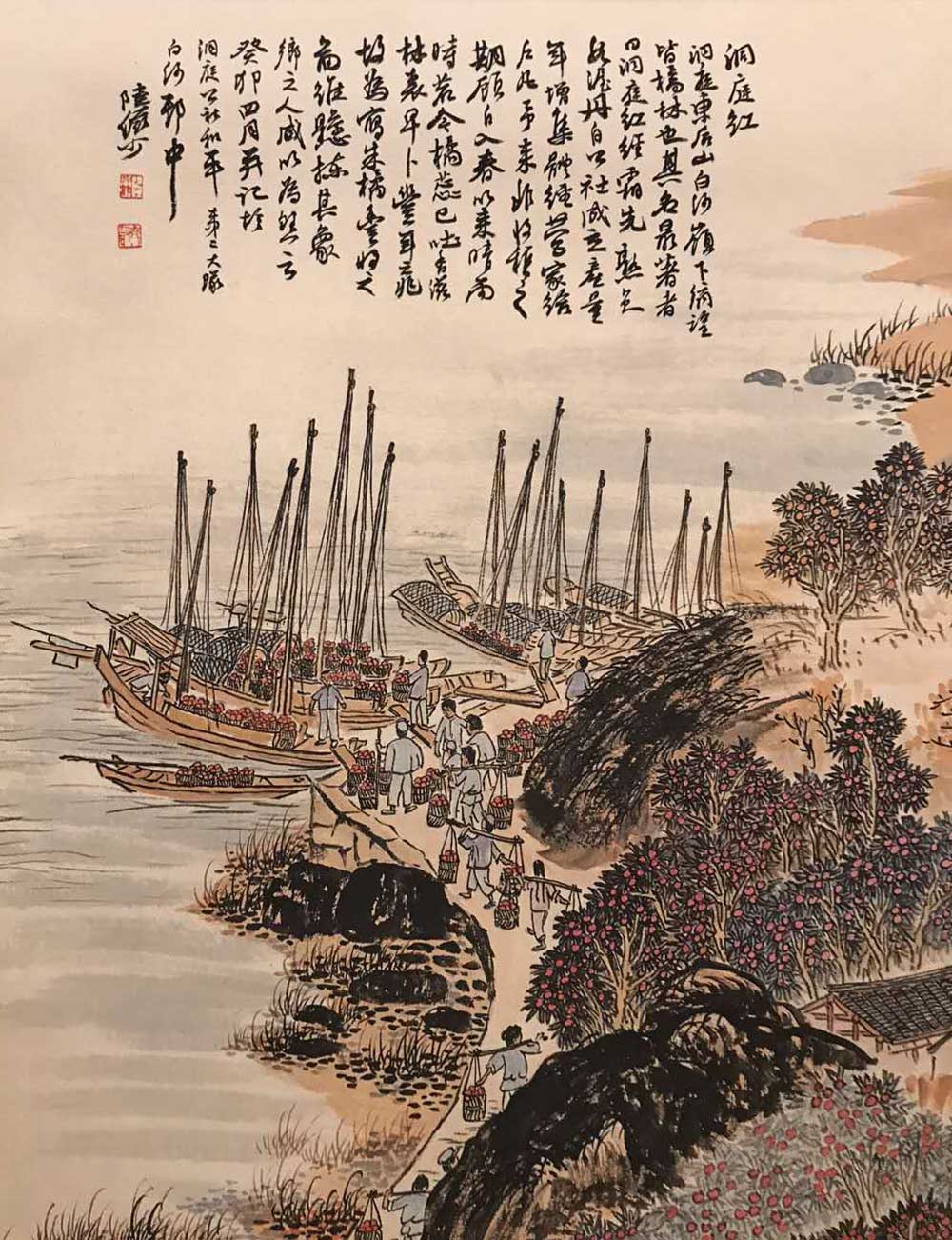 此幅《洞庭红》,以深秋江南太湖地区收获著名的洞庭红甘桔的情境为对象而创作的绘画作品,带有明显的时代印痕。描写劳动中的人民,一片笑语欢声,摘果、抬果、运果一系列的劳动通力协作,硕果累累的金秋美景跃然纸上,欢快之情溢于言表。霜风染红了洞庭的枫叶,吹熟了山下的桔林。艺术家也不甘示弱,用手中的画笔描绘祖国的大好美景,红色题材成为那个时代的独特风貌。整幅工写结合,构思巧妙,以生动的场景表现出了时代的面貌,是一幅映射着时代特色的新国画。