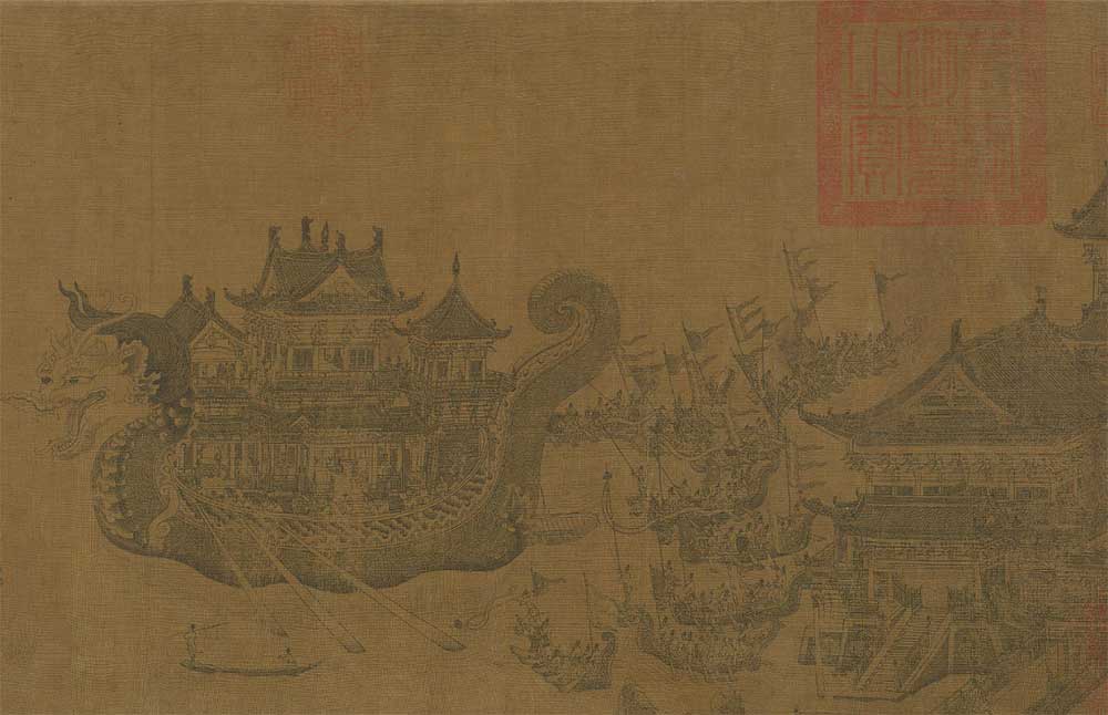 墨线白描界画楼阁反映了元代建筑绘画最为典型的时代新风,宫廷画家王振鹏则是这种风格的代表人物。他曾先后两次画过《金明池夺标图》卷,描绘的是北宋崇宁年间(1102-1106年),每年皇室在宫廷后苑金明池举办龙舟竞渡的盛大场面。由于王振鹏颇负盛誉并受到当时贵戚大长公主的赞赏,引得后人纷纷临摹,至今传世的摹本和改绘本仍有七八本之多。