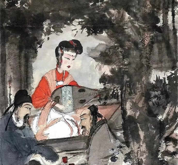二绝:以群体“勾魂眼”凸显作品主题。在《丽人行》、《琵琶行》、《眉锁章台》、《兰亭修禊图》、《文会图》、《游春图》、《九老图》、《青枫欲赤》和《人民公社好》等等,一大批人物画中,大师以群体“勾魂眼”为我们奉献了一代国色,其中《丽人行》则有37人之多、《兰亭修禊图》则更多且不见首尾,表现了一个合于主题的宏大场景,也成为大师人物画的一大经典特色。
