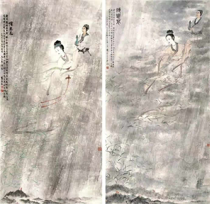 ▲ 左图:傅抱石 《蝶恋花 · 答李淑一》词意图 轴 纸本 设色137.2×69cm 1958 年7 月 南京博物院藏 右图:傅抱石《蝶恋花 · 答李淑一》词意图 轴 纸本 设色185×94.7cm 1958年月旅顺博物馆藏