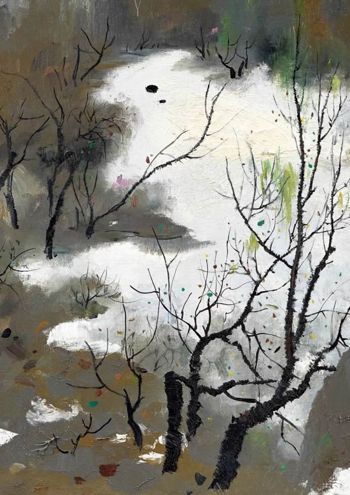 京郊白花山,山高天寒,五月天,山下的桃花早已凋谢,山上春寒料峭,花蕾初吐。在密林间探幽,突然发现一大片厚厚的积雪,像是山涧的源头。因被包围在幽暗的丛林深处,残雪显得分外地白,白得分外孤独,春天遗忘了她,她被遗忘在去年的冬天里。—— 吴冠中《遗忘的雪》