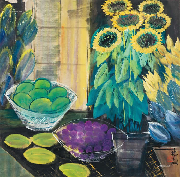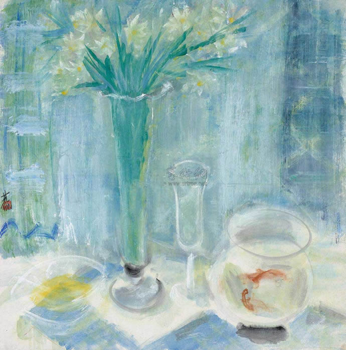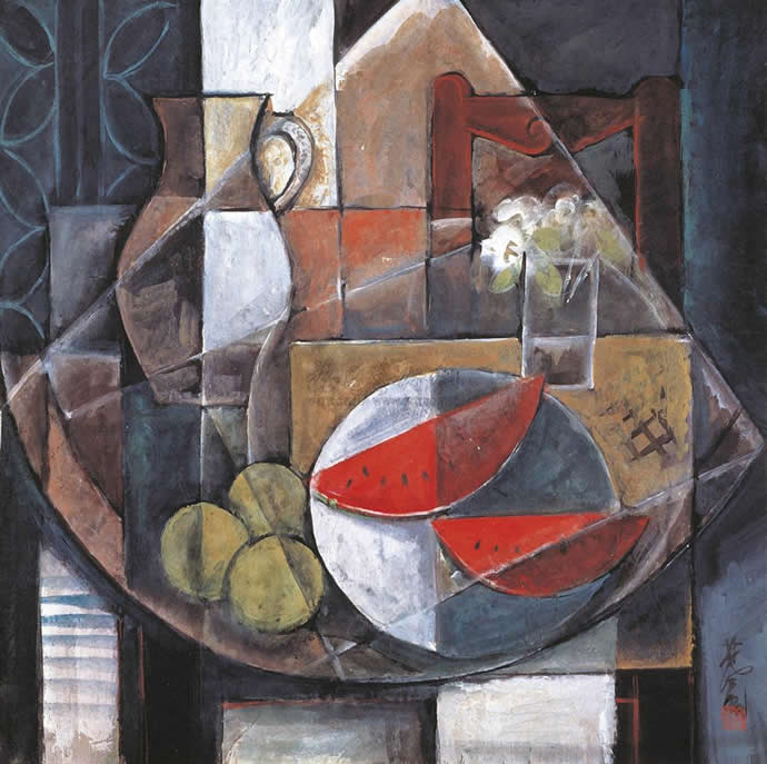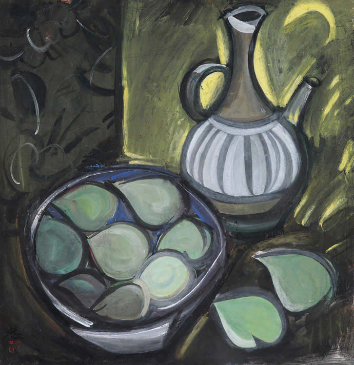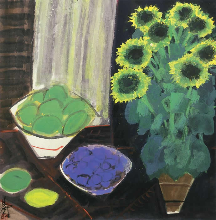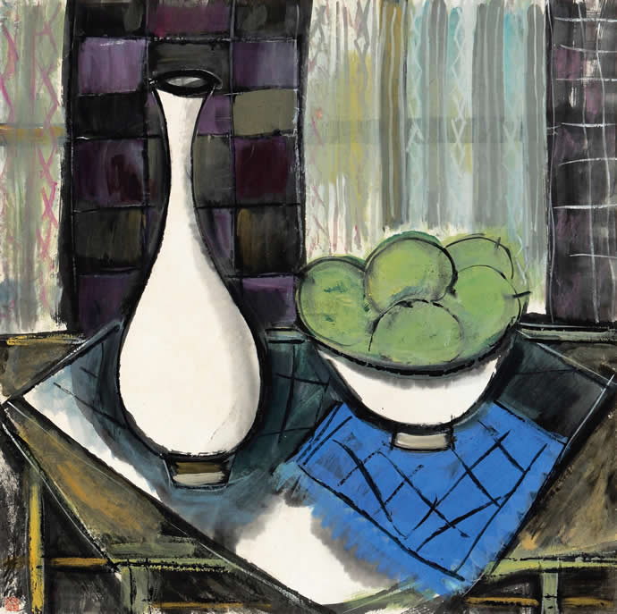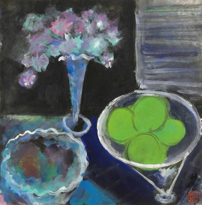 林风眠的静物画大多画瓶花、盆花、玻璃器皿、杯盘、水果等。在这一些静物作品中,他探索构图、色彩、线描与色光的结合,东方神韵与西方形式的统一。在形式求索背后,是对美和生命活力的无穷追求。