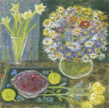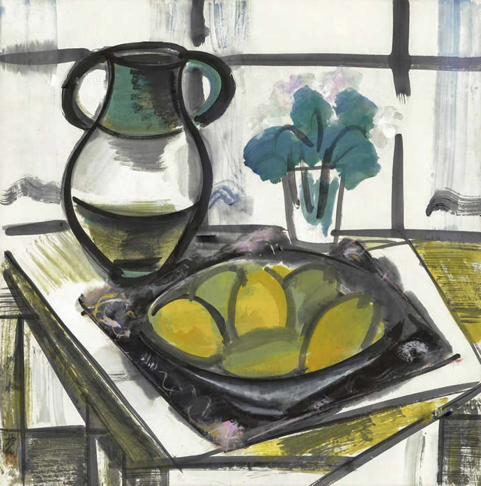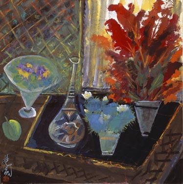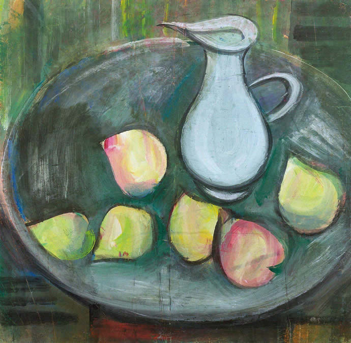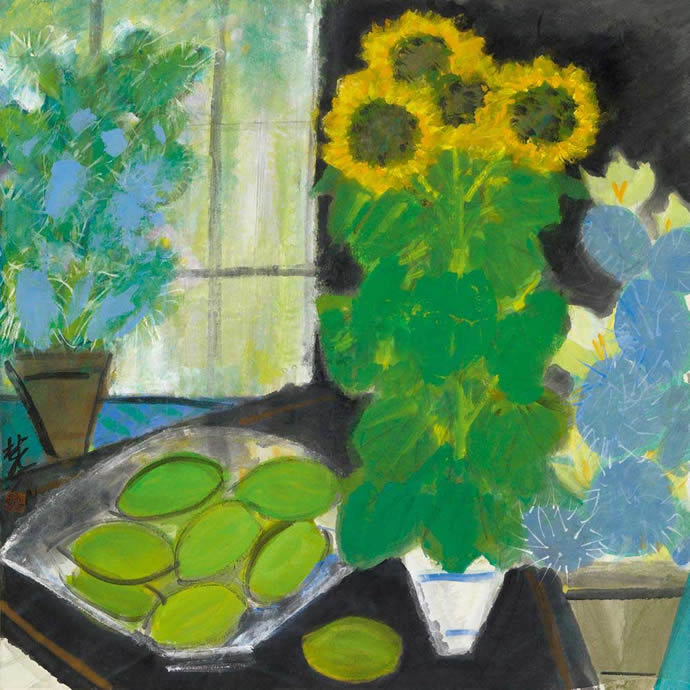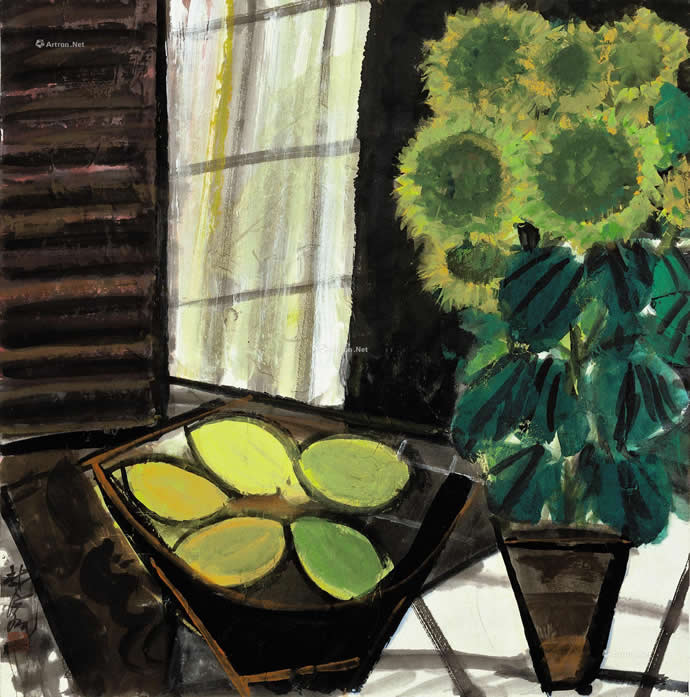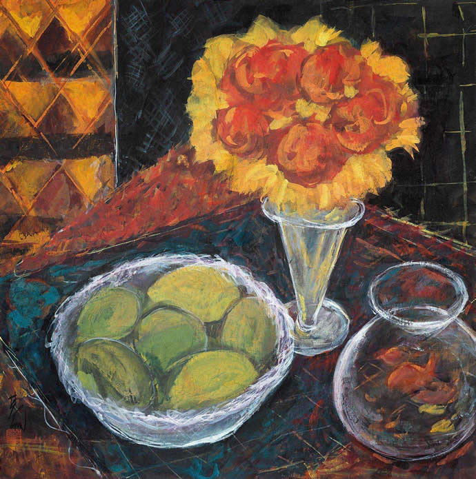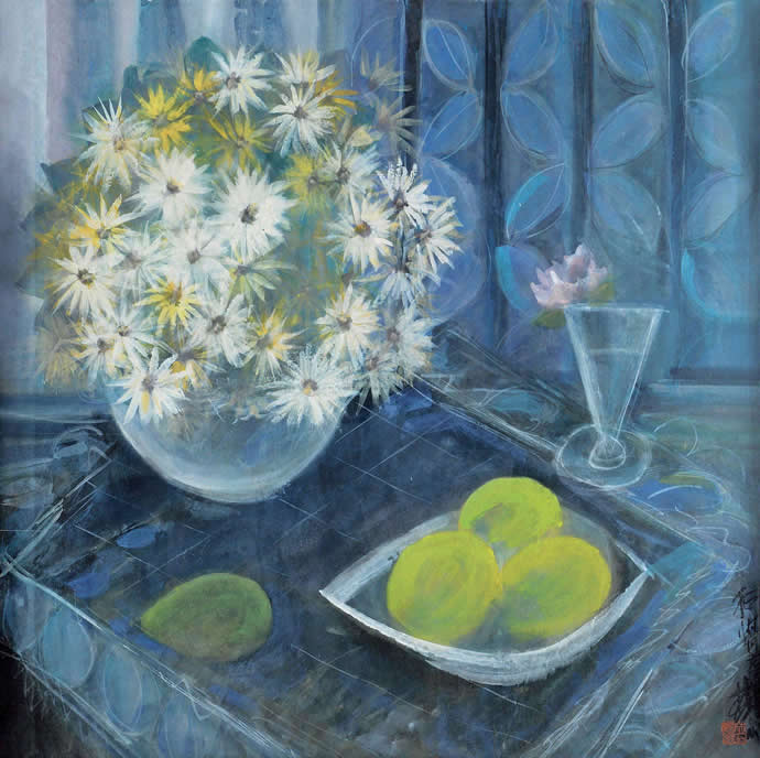 林风眠的静物画大多画瓶花、盆花、玻璃器皿、杯盘、水果等。在这一些静物作品中,他探索构图、色彩、线描与色光的结合,东方神韵与西方形式的统一。在形式求索背后,是对美和生命活力的无穷追求。