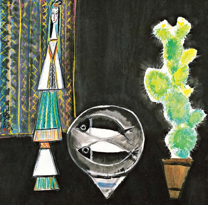 15、林风眠 约1977年作 鱼盘仙人掌静物 彩墨 纸本