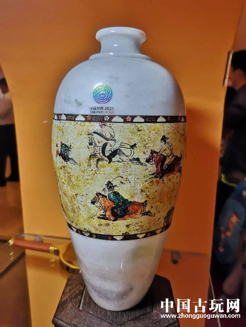 据了解,本次展出的蓝田玉特许商品中马球图玉瓶备受大家青睐,玉瓶采用了中国现存最早的动态体育运动图画马球图,并邀请敦煌壁画修复绘画大师手工彩绘马球图。既突出了长安的盛唐文化,又体现了古代马球运动的体育传承。