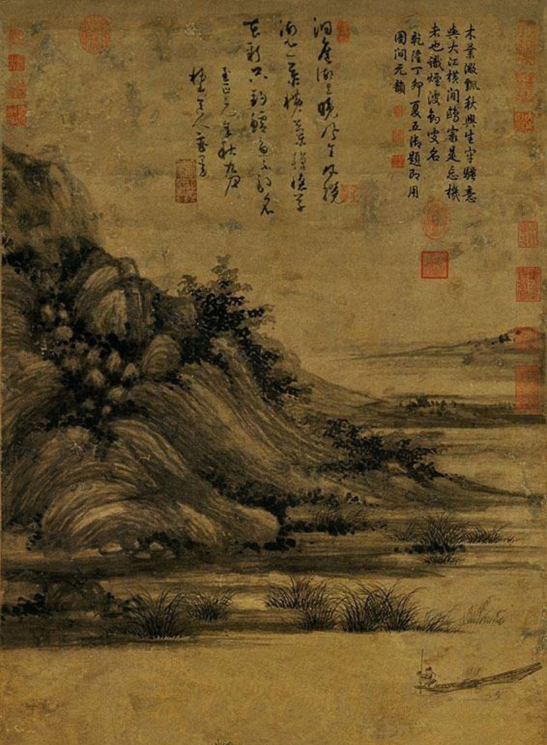 《洞庭渔隐图》是元代画家吴镇在至正元年(1341年)秋九月创作的中国画,现藏于台北故宫博物院。该画作采用“一河两岸”式的构图。近景画双松挺立,枯树横斜,隔岸则是迤逦的山坡,与水边荡桨的渔舟,十分忠实地呈现出江南水乡泽国的景象。虽然布局简略,但添加边角的签名,以及上方的题词之後,别具一番宁静典雅的情调。