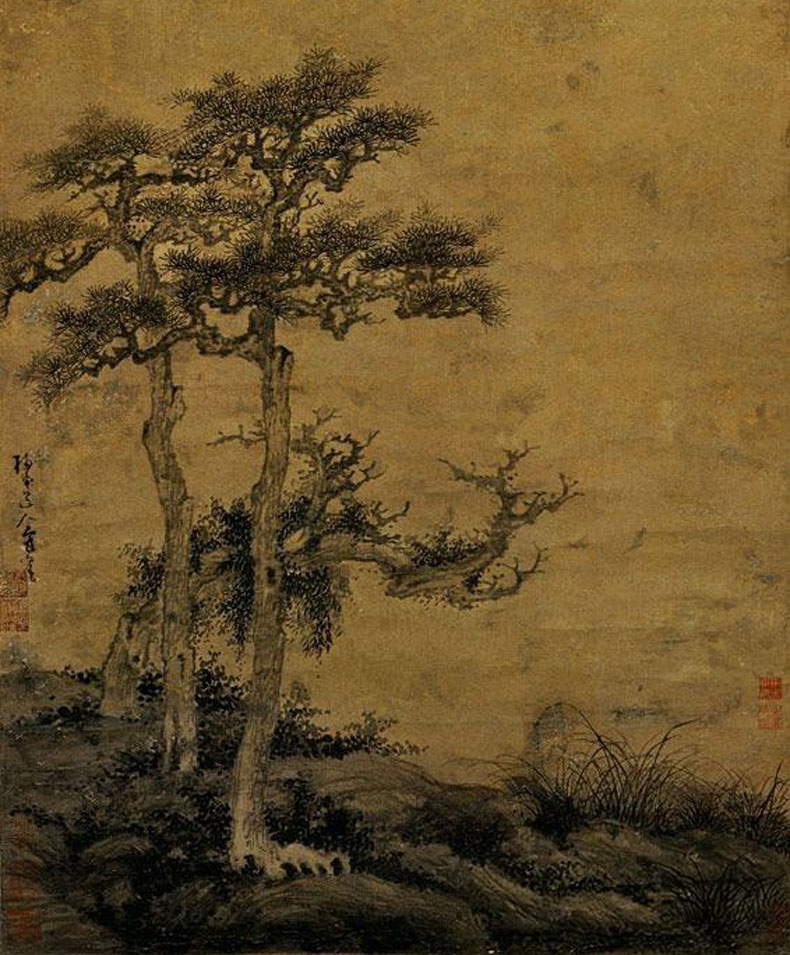 此画描绘嘉兴东洞庭的湖山景色,画中三株松柏,两株松树挺立昂扬,一株柏树则几乎仆地,缠满藤蔓,水面平静无波,一叶扁舟飘荡其间,远望是连绵的山坡,充分发挥水墨氤氲的特性,画出了江南水滨的静美幽澹,表达了宁静淡泊的心境,具有一种典雅的韵致。图上原题:“洞庭湖上晚风生,风揽湖心一叶横。兰棹稳,草花新。只钓鲈鱼不钓名。”诗意清新,坦言其志。