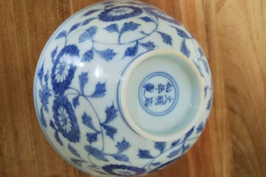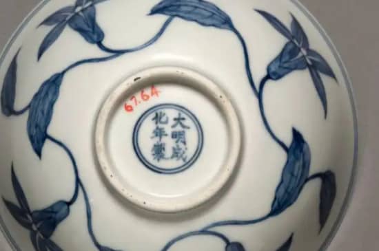 成化青花瓷是有一人书写,字体较为规范并且一致,在青花瓷底部标有大明成化年制字样,为双行楷书,外部双线方栏,是成化后期的产物,并且大字型比较瘦尖,圆头非高。
