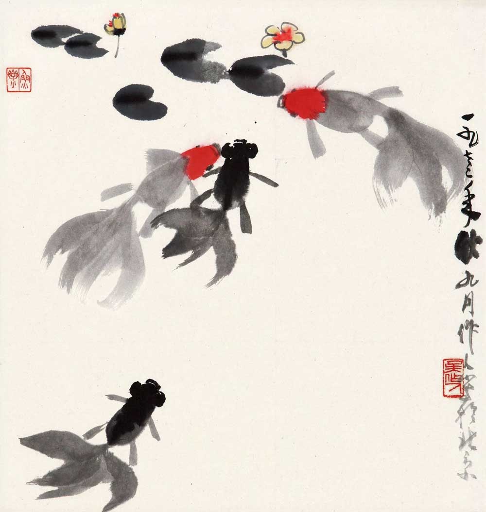 对金鱼背鳍、眼珠等部位也是运笔独到,使金鱼不仅有动态美,更具体形美,似动似静,悠然自得。为了表现对象特有的雍容华贵,所以少用浓墨,而是以不同色彩,适当添入淡墨,去表现金鱼在水中畅游的神态,色彩更为美丽,优雅飘逸。