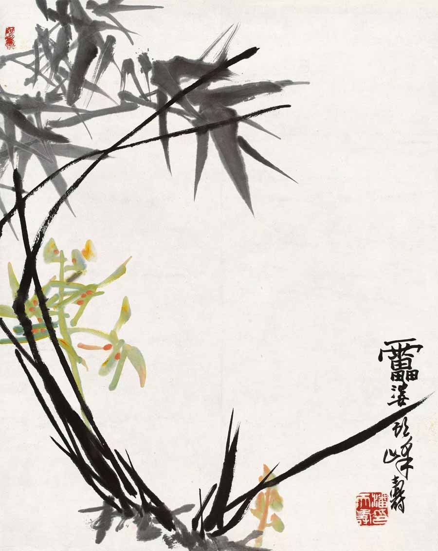 是幅潘天寿花鸟画《兰竹梅图》从创作风格上看应该是1960年左右作品。其花鸟画与传统的最大不同就是取险,在金边银角上头来取势,将结构的张力,推到边缘的极致。另外此作品形精简而意远,笔墨凝炼而沉健。是潘天寿晚年精品无疑。(注:潘天寿于1933年曾作过相似作品)