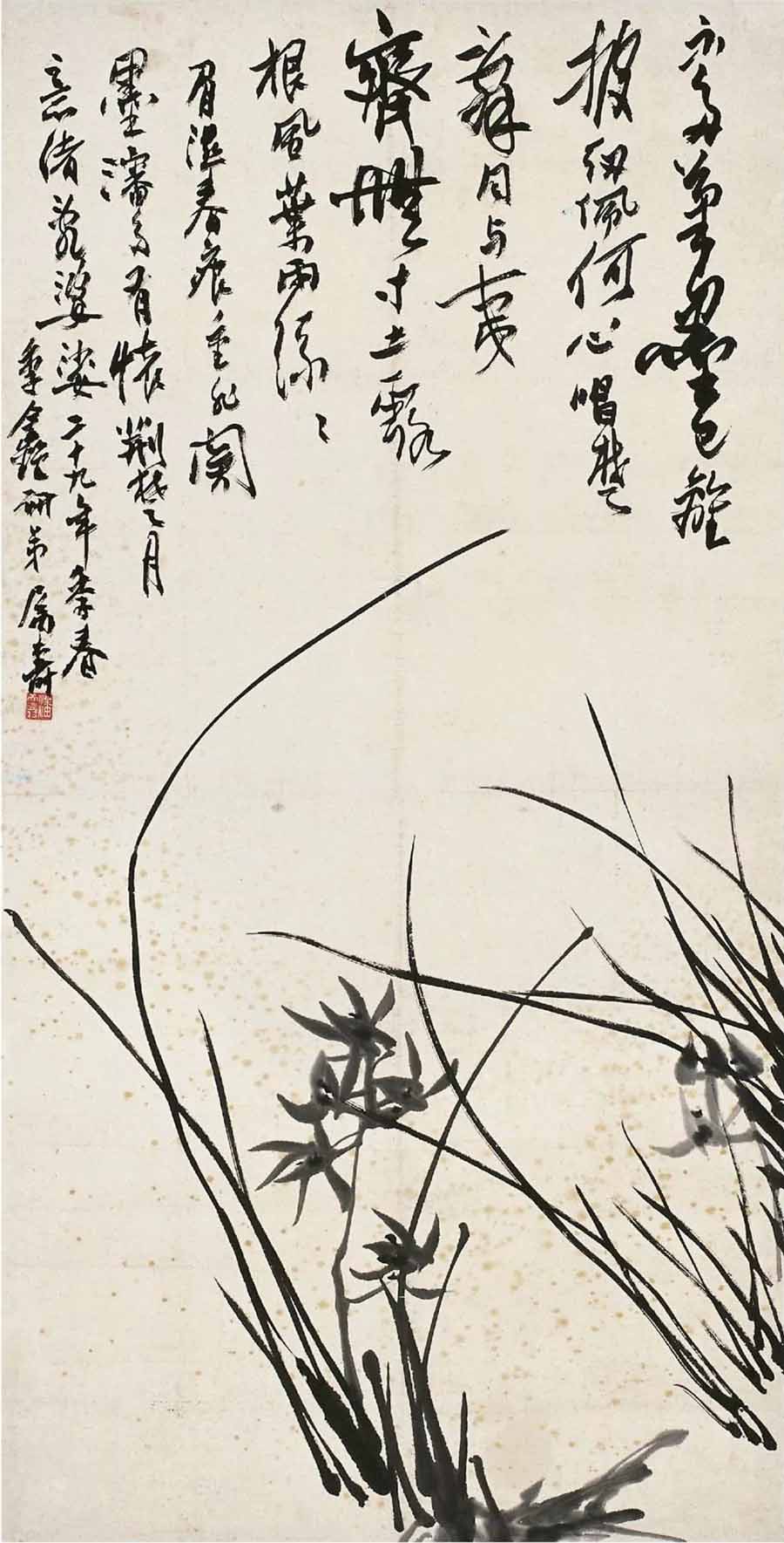 潘天寿喜画兰,与前人不同的是,他画兰从骨气、骨力取胜,追求雄健、豪壮、气势、刚阳。潘天寿对于兰的气质可谓情有独钟,兰古称君子之花,象征着人格的高洁与不逐尘俗,此中兰花,以书意写之,柔中见刚,极见功力。可谓君子与兰融汇,超凡脱俗,洁身自好,概源于此。