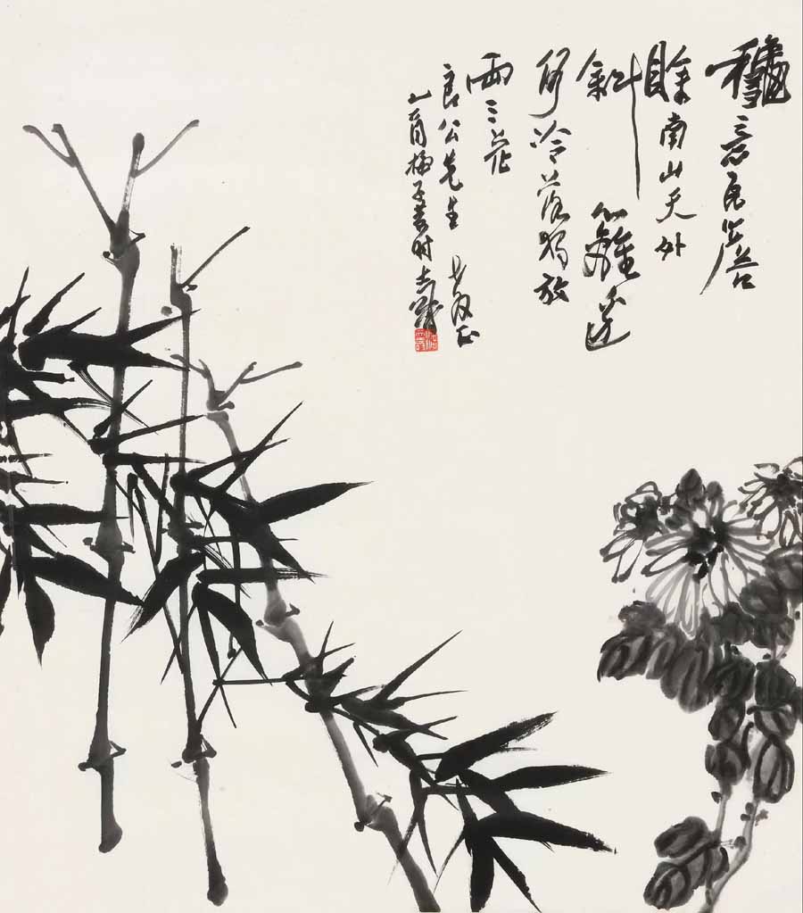 潘天寿的花卉作品博采众长,除早期学习朱耷、石涛等前贤绘画及构图特点以外,吴昌硕以石鼓文入手金石绘画也成为左右潘天寿花卉技法的关键组成部分,其构图新奇、壮阔,布局敢于“造险”、“破险”,运笔苍劲泼辣,用墨注重黑白对照,有破常规之举。《梅兰竹菊》是潘先生反复入画的题材,画来得心应手,一气呵成。潘天寿在此作的构图中使用了他所惯用的“造险”与“破险”技法。同时是幅作品形精简而意远。巨石、兰草、梅花与清竹,各种对比在构图上形成一种张力,使简单的画面呈现出丰富的视觉效果,且获得与众不同的新奇意境!