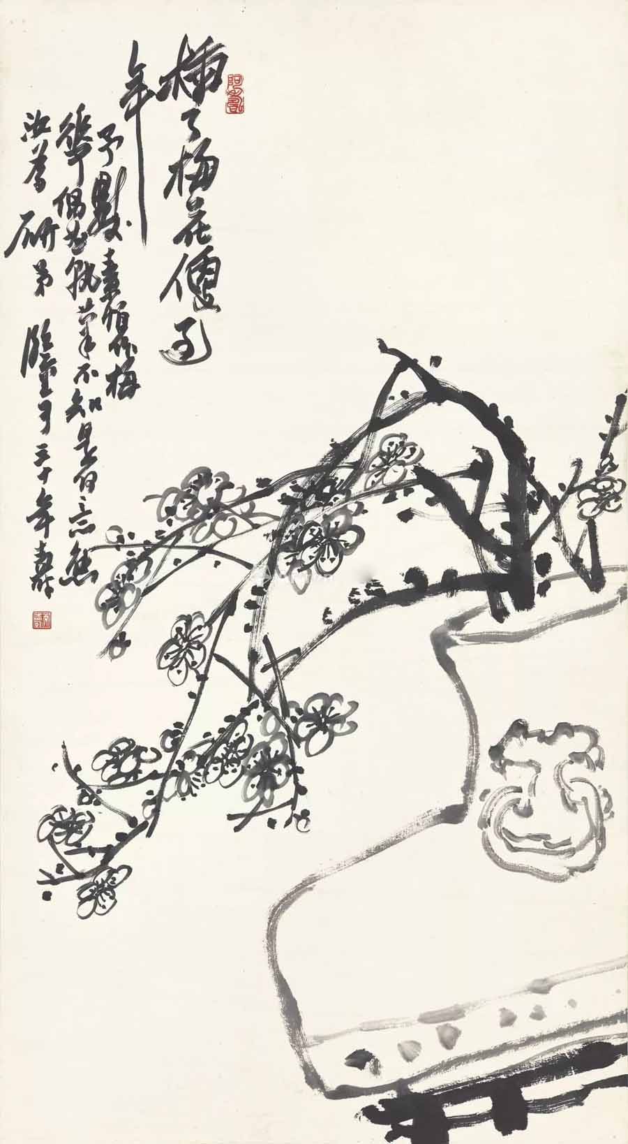 其次为贯穿整个画面中部的梅花。此梅花用浓墨呈三角形构图,似一块突兀的岩石,与方形构图相呼应。亦增加了画面的平衡感。梅干是以书法的手法完成,起承转合极富节奏。在中国绘画史上,不知有多少画家画过梅花,而将梅花画得如此苍古高华,恐怕难有其匹。梅居传统“四君子”之首,面貌清丽、雅逸,本是传统文人清高拔俗的道德品格的象征,潘天寿在继承这一传统的同时,进一步赋予了梅以刚毅雄悍的气质。此幅作品中的梅花,无论结构和姿致都奇崛过人,孤花开放的情境,更是清超绝俗。