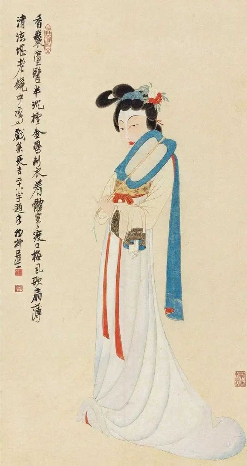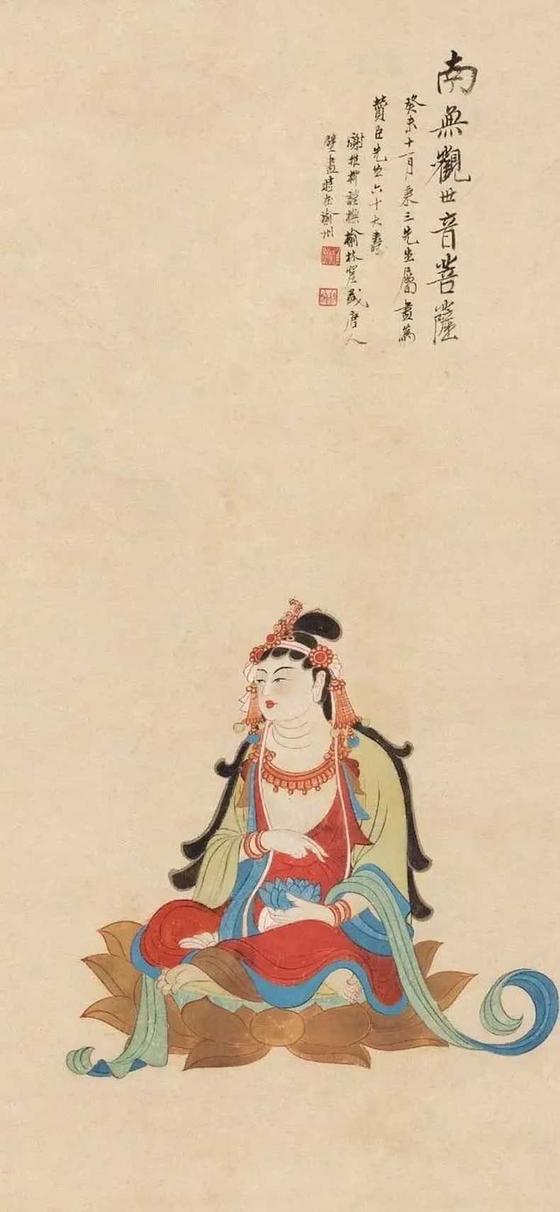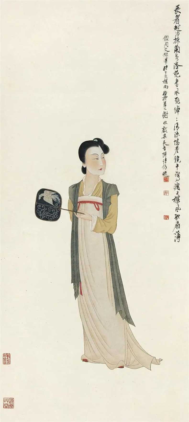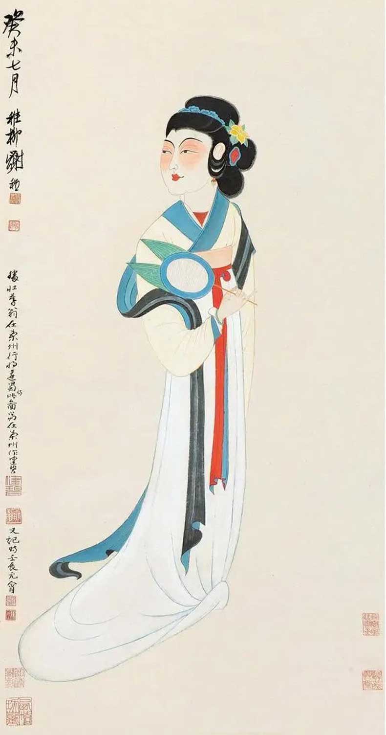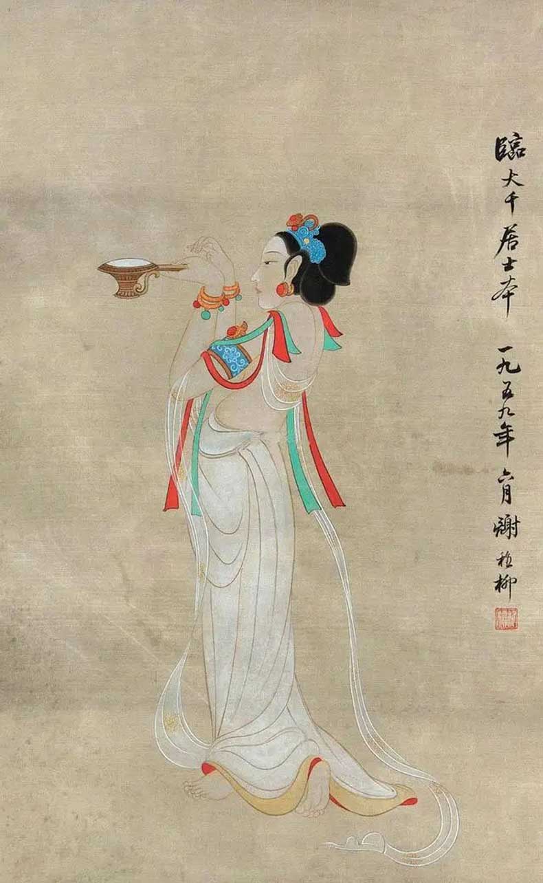 20世纪40 年代初,张大千带领大风堂弟子前往往敦煌考察,历时将近三年,为敦煌的艺术发展做出了卓越贡献。同时谢稚柳应张大千邀约赴敦煌考察,在晋唐时的千壁丹青,给予了谢稚柳极大的震撼。谢稚柳在敦煌的一年,与张大千不同的是他系统整理画窟资料而非临摹壁画,因此开敦煌学先声。归来后居上海,谢稚柳画了大量佛像和人物以及仕女图,画风基本皈依唐宋。