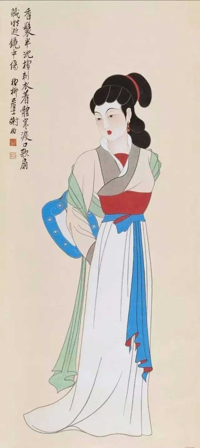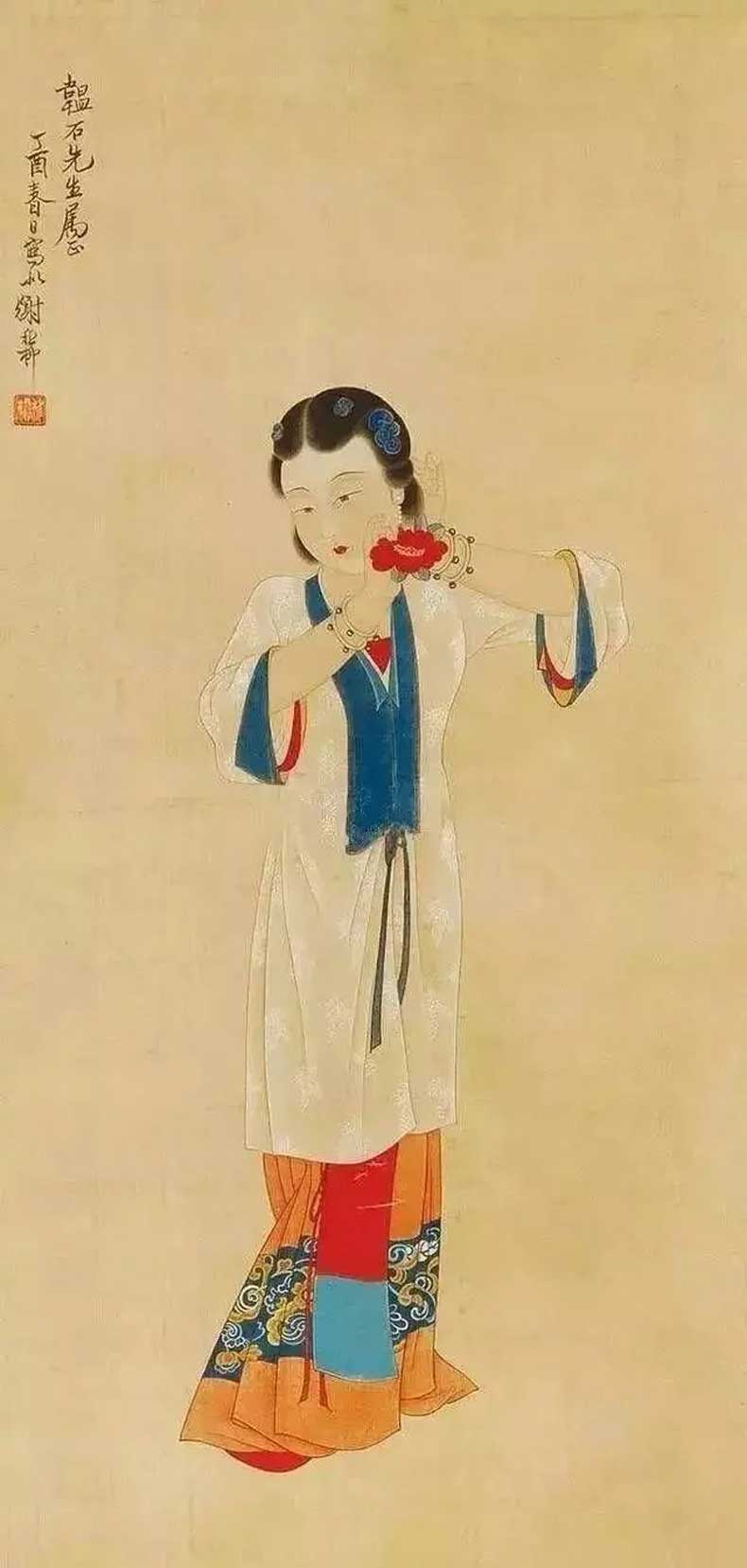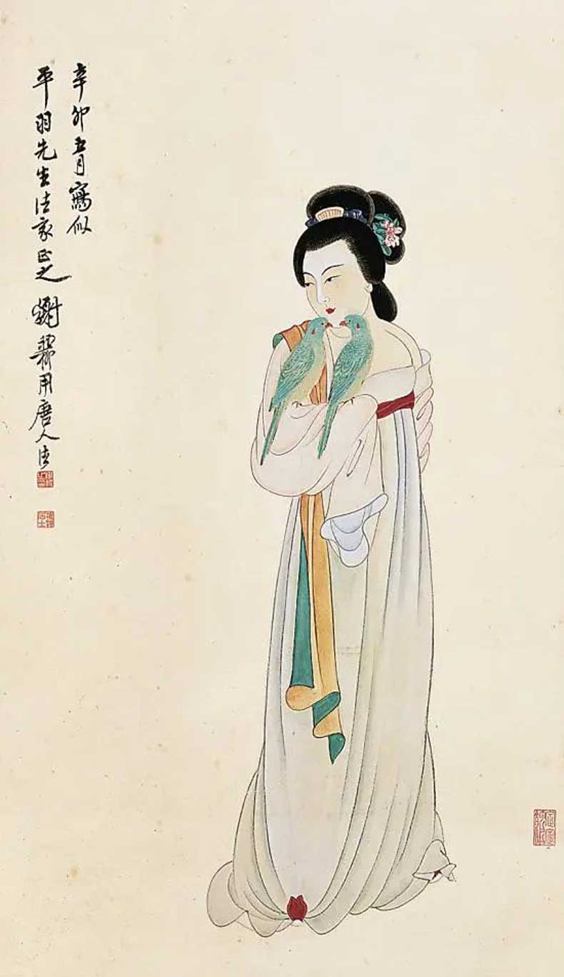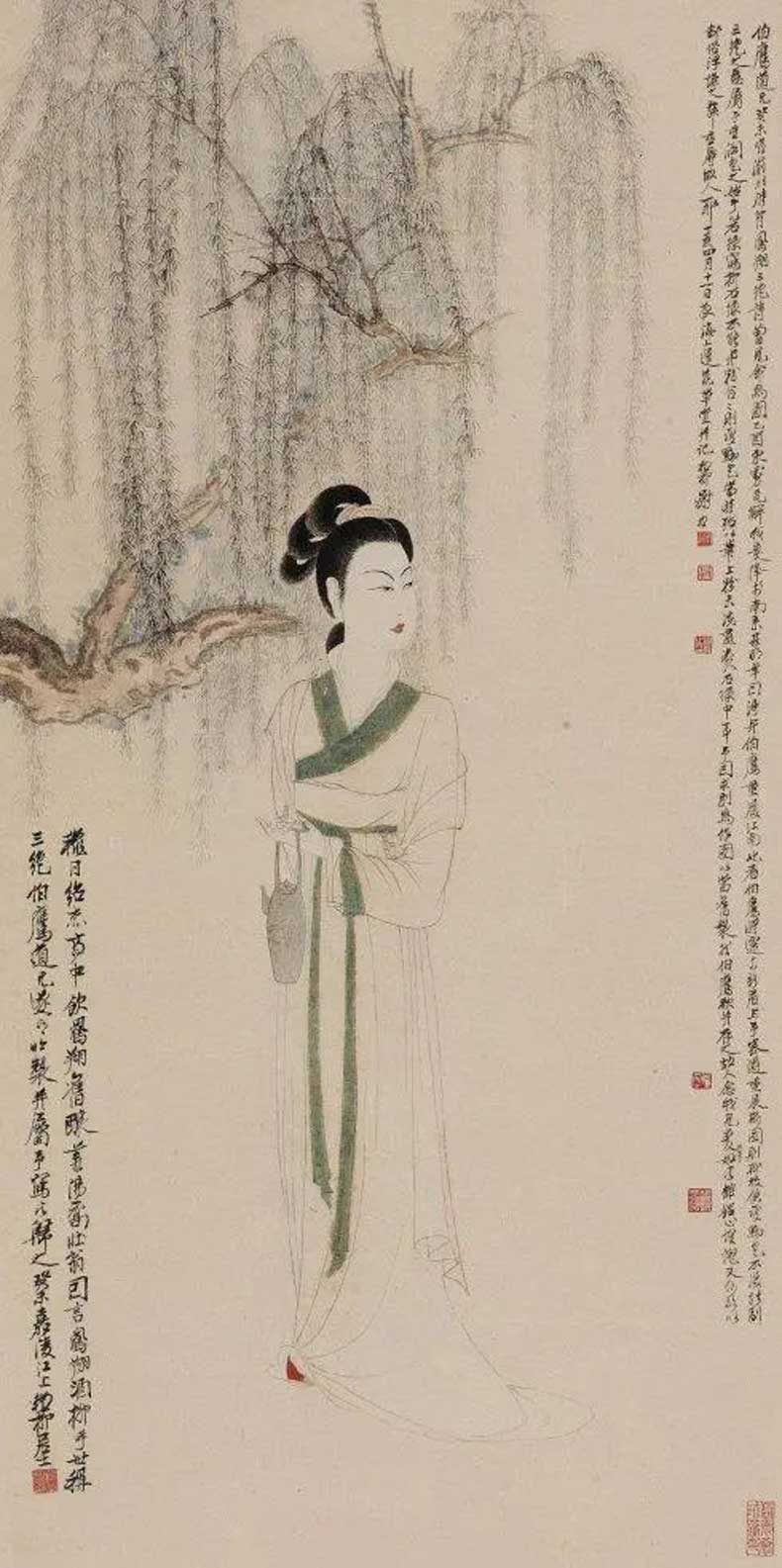 20世纪40 年代初,张大千带领大风堂弟子前往往敦煌考察,历时将近三年,为敦煌的艺术发展做出了卓越贡献。同时谢稚柳应张大千邀约赴敦煌考察,在晋唐时的千壁丹青,给予了谢稚柳极大的震撼。谢稚柳在敦煌的一年,与张大千不同的是他系统整理画窟资料而非临摹壁画,因此开敦煌学先声。归来后居上海,谢稚柳画了大量佛像和人物以及仕女图,画风基本皈依唐宋。