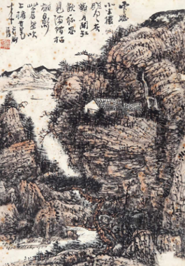 题识:层岩古木乱泉飞,空山深处宅园居。笔下云烟无处卖,将拾残稿窅然归。甲寅初伏挥汗画此。半个僧。