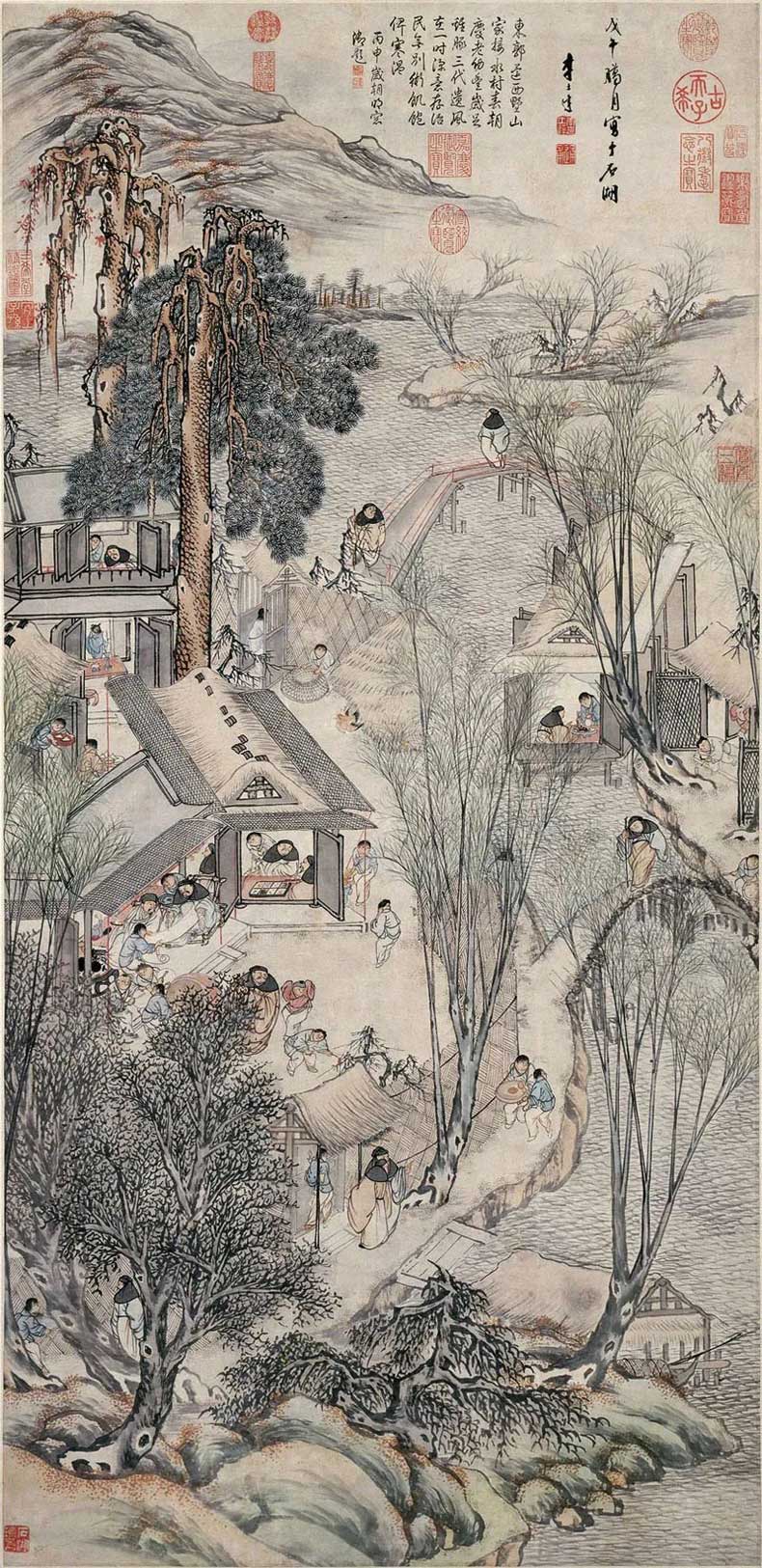 这幅作品是一幅风俗画以山水为背景,画面绘有山石、树木、屋宇房舍,溪水板桥,坡石堤岸、鸡鸭杂豚。诸多人物布置其间:有的在屋内端坐,向外眺望;有的在屋内相面而坐,正在交谈;有的在林中穿梭,游览水村山乡;有的正在滑梯;有的正捕鸡斩鸭;有的长者或士人正在观赏画卷;诸多的童子正在捉迷,表现了一派热闹非凡的山乡景象。