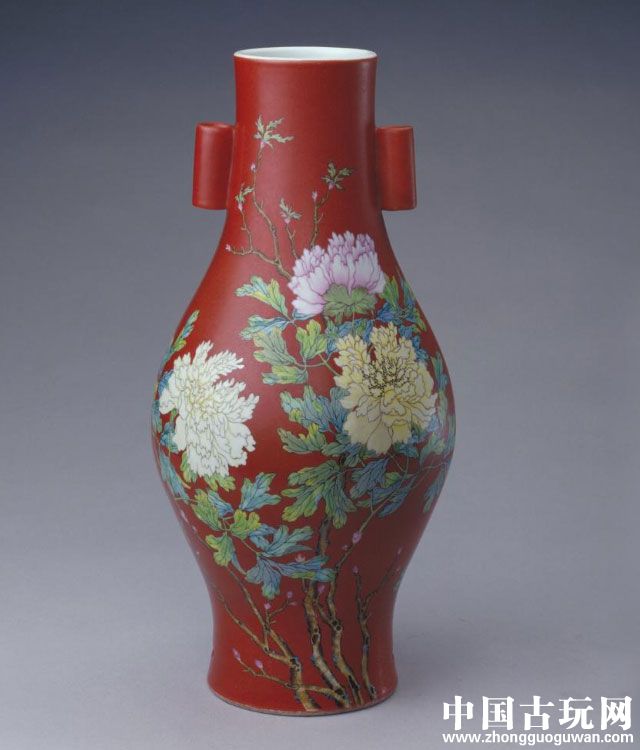 清雍正珊瑚红地粉彩牡丹纹贯耳瓶
