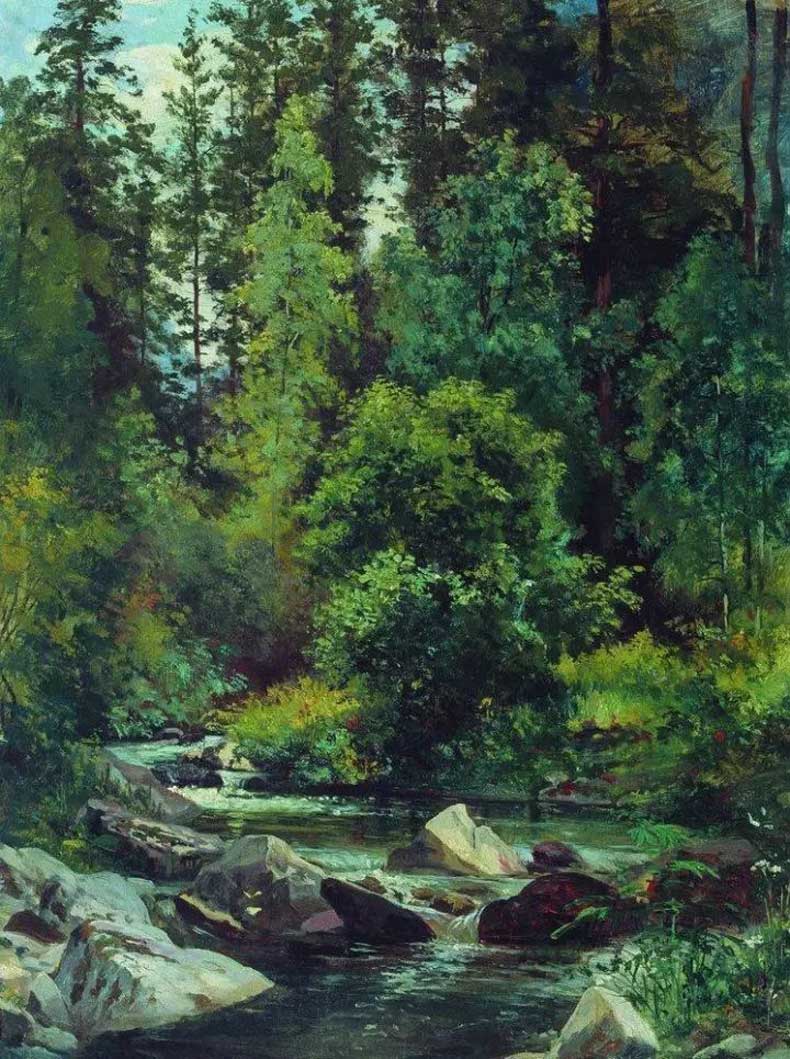 伊凡·伊凡诺维奇·希施金(Ivan I. Shishkin)(1832—1898)是19世纪俄国巡回展览画派最具代表性的风景画家,也是19世纪后期现实主义风景画的奠基人之一。希施金的风景画多以巨大的、充满生命力的树林为描绘对象,那些摇曳多姿的林木昂然挺立,充满生机。繁木菁林,疏密有致,大森林的美与神秘,被渲染得淋漓尽致,可谓美不胜收。