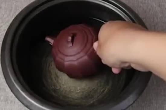 先用刷子刷洗干净内外,刷拭干净的茶壶要放入温水内并用小火煮沸5分钟,之后往里面放入茶叶继续煮10分钟熄火。熄火冷却5分钟后,用小火再次煮沸茶水15分钟并熄火,用余热焖壶10分钟后再次煮沸15分钟,冷却3~5小时后冲洗干净。