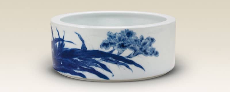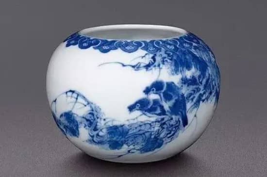 国画上的渲染在青花上被称作分水,青花上的分水在刚制作时显得黑压压一片,只有在烧成之后方可见到效果。烧成之后的分水从浓到淡一气呵成,料分五色,浑然一体,用笔圆润苍劲,线条犹如惊蛇走龙,疾驰于淋漓苍润的云水之中。
