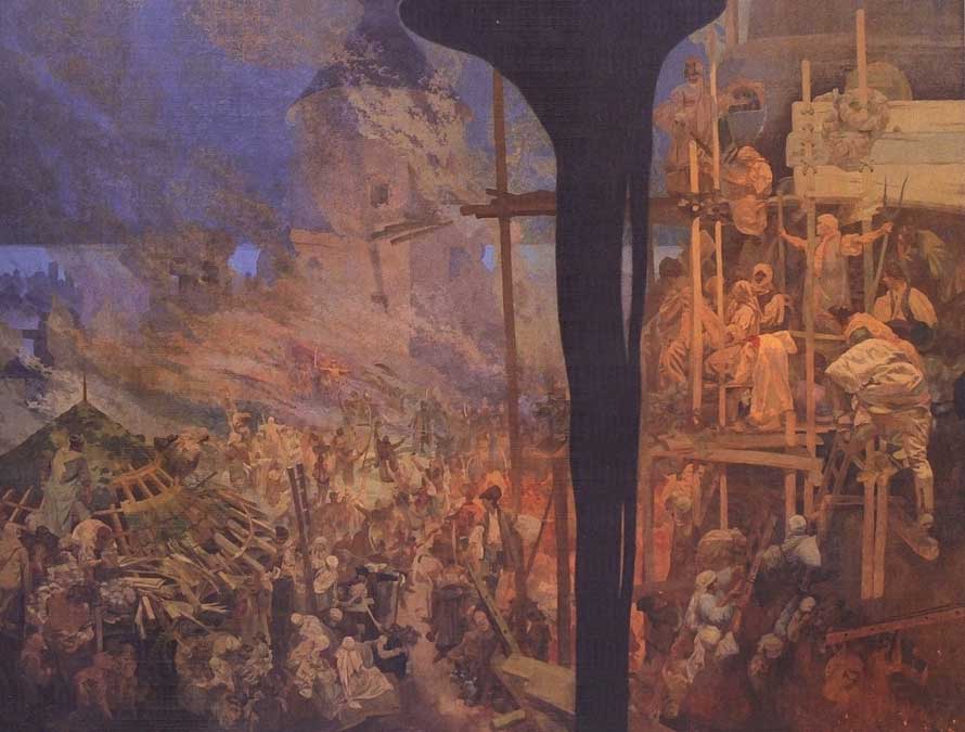 1912年-1926年,穆夏花了14年的时间完成了“斯拉夫史诗”的创作,这一系列作品饱含了穆夏对于时间跨度超过1000年的斯拉夫民族历史富有远见的个人观点。1928年9月,在捷克斯洛伐克成立十周年之际,穆夏和赞助人查尔斯·克莱恩一起将完整的“斯拉夫史诗”正式捐赠给布拉格市政府。