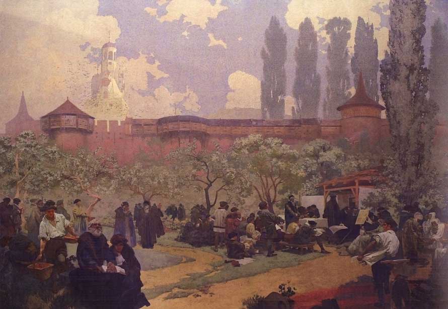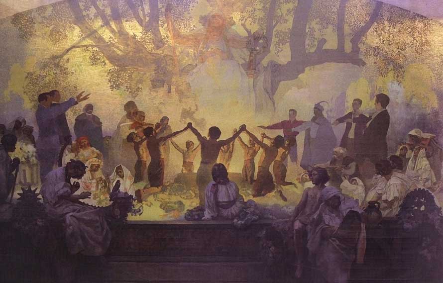 阿尔丰斯 穆夏(1860—1969)捷克画家,他在1928年完成了”斯拉夫史诗“系列的油画。这一宏篇巨制描绘了斯拉夫民族从史前到19世纪的漫长历史进程有纪念意义的场面,整个主题包括20幅巨大的油画作品。