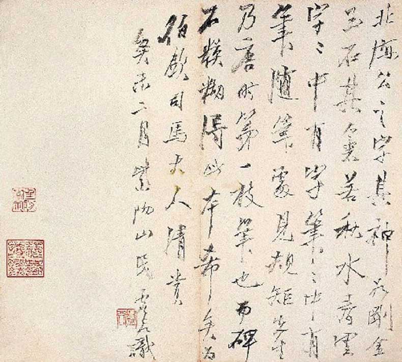 书法是虚谷上人闪光的一大亮点,亮点之处就是他与众不同的独特个性。其书法在整个创作过程中总给人有一种枯涩苍润的感觉。而更让人叹妙的是,其书五体兼融,且风格统一完美,有高士古雅之气。所制画作,诗情书法相得益彰。顾鹤逸在《虚谷山水手卷跋语》中写道:“虚谷山水清而不枯,密而不乱,此六法上乘也,惟老友虚谷上人能之”。此跋虽是赞美其画,然而我认为引喻其书同样恰当。