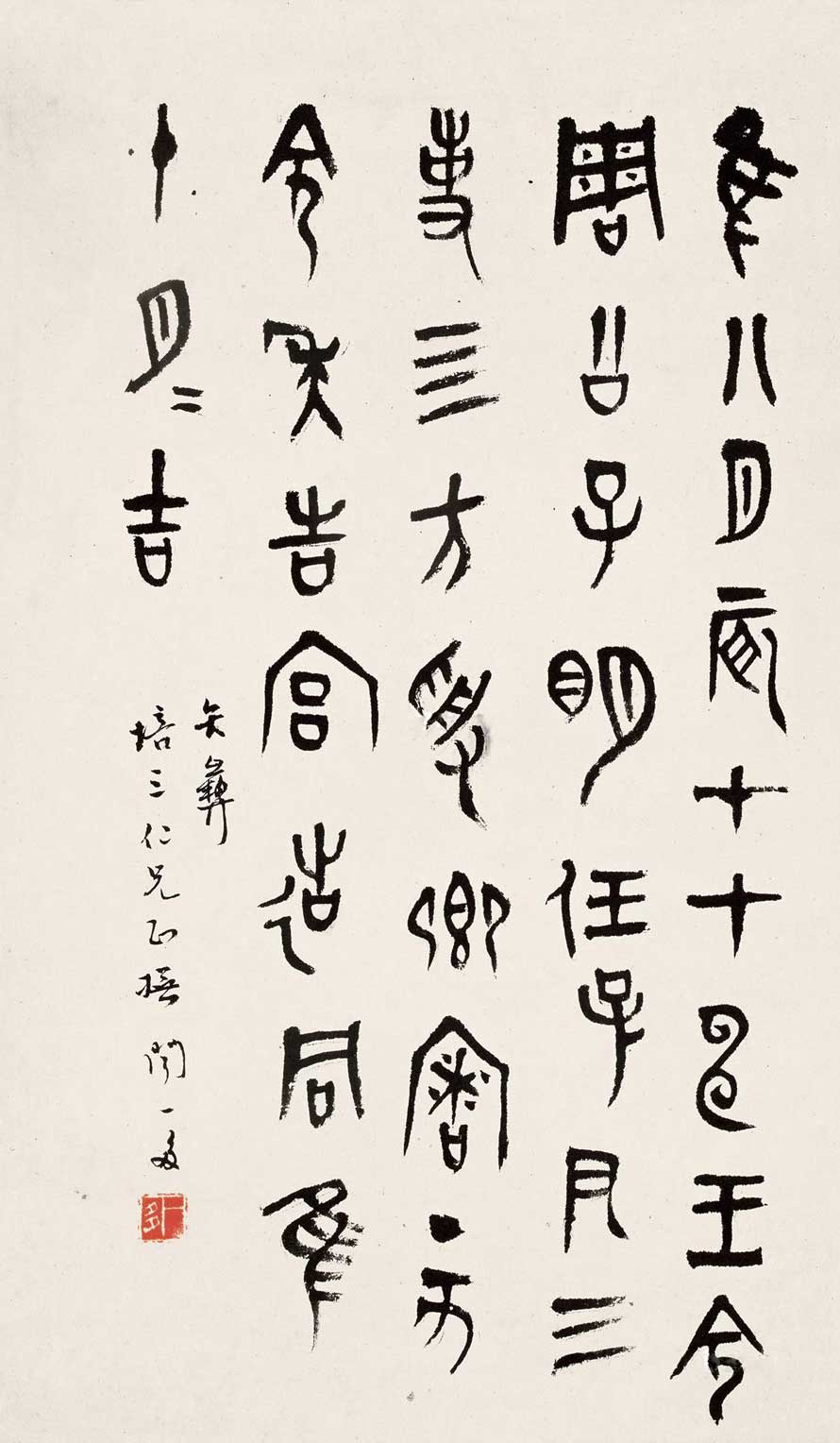 反观闻一多先生的书法,他似乎最擅篆书,所留下的墨迹也以篆书为多,这和他后来将主要精力研究于诗经、楚辞以及甲骨文、训诂学有很大的关联。闻一多的性情刚直而率真,他是新文学运动后新月诗派的代表人物之一,虽有着丰沛才气的诗人气质,但他更多是有着强烈的民族正义感和耿直的书生意气,这一点也显露在他的书法作品中,闻一多的书法线条凝涩厚重,笔力千钧。