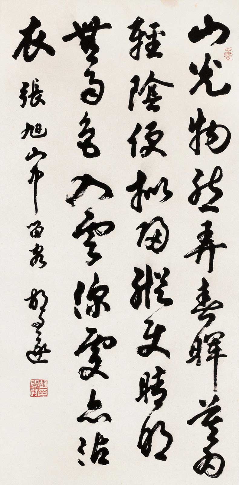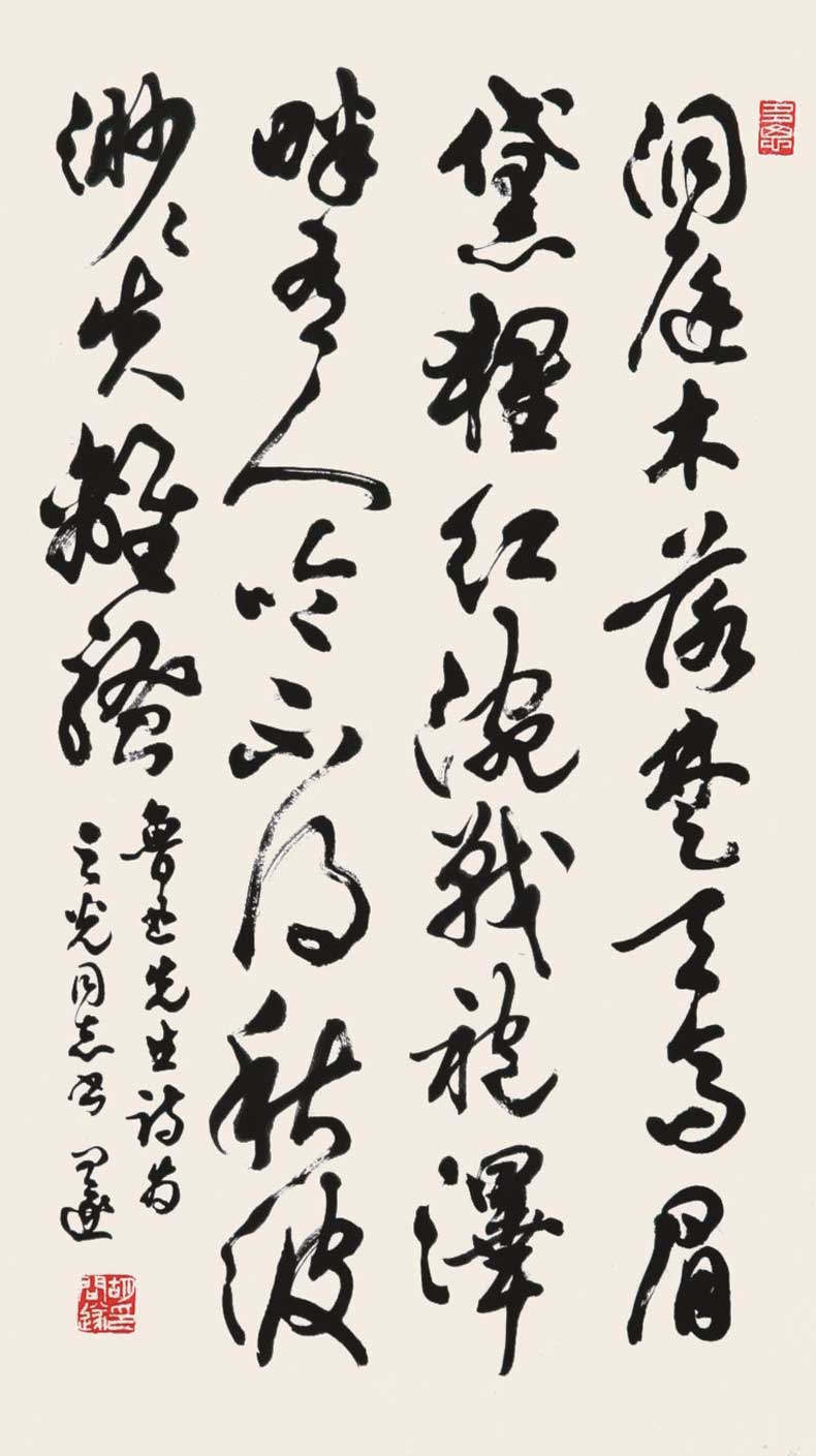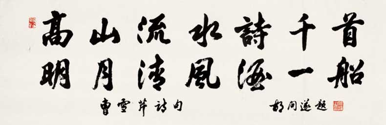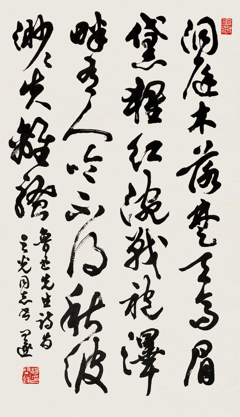 胡问遂早年学柳公权,继学颜鲁公,得厚重丰润之精髓,转习褚遂良,得缜密灵动之韵致。后溯二王行草,兼及智永、李北海、苏轼、黄庭坚、米芾、蔡襄等,数十年坚持不懈。其书法浑厚凝重,洒脱灵动,气韵高雅,意态从容,是海派书法艺术的典型代表人物。作品多次入选国内外重大书法展览,并为博物馆、纪念馆、名胜地收藏或翻刻入石。
