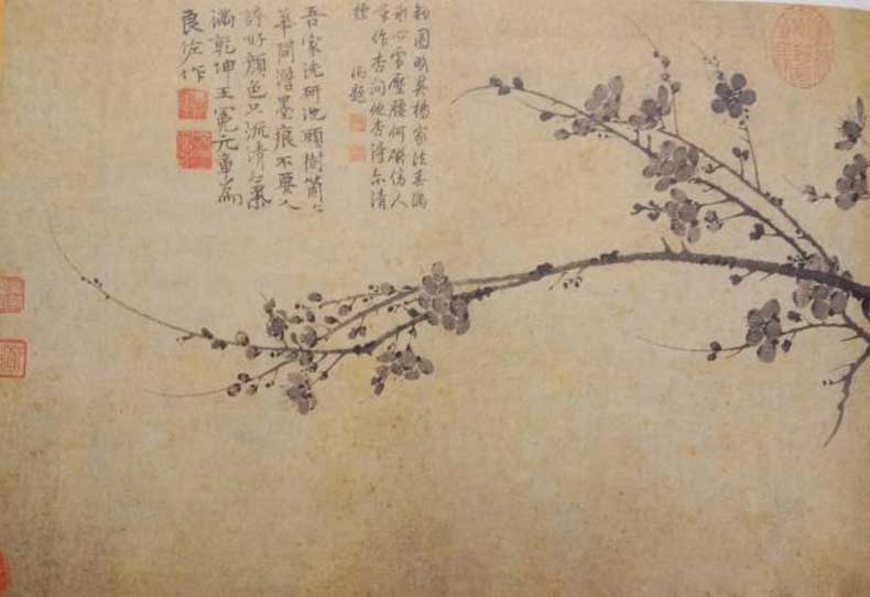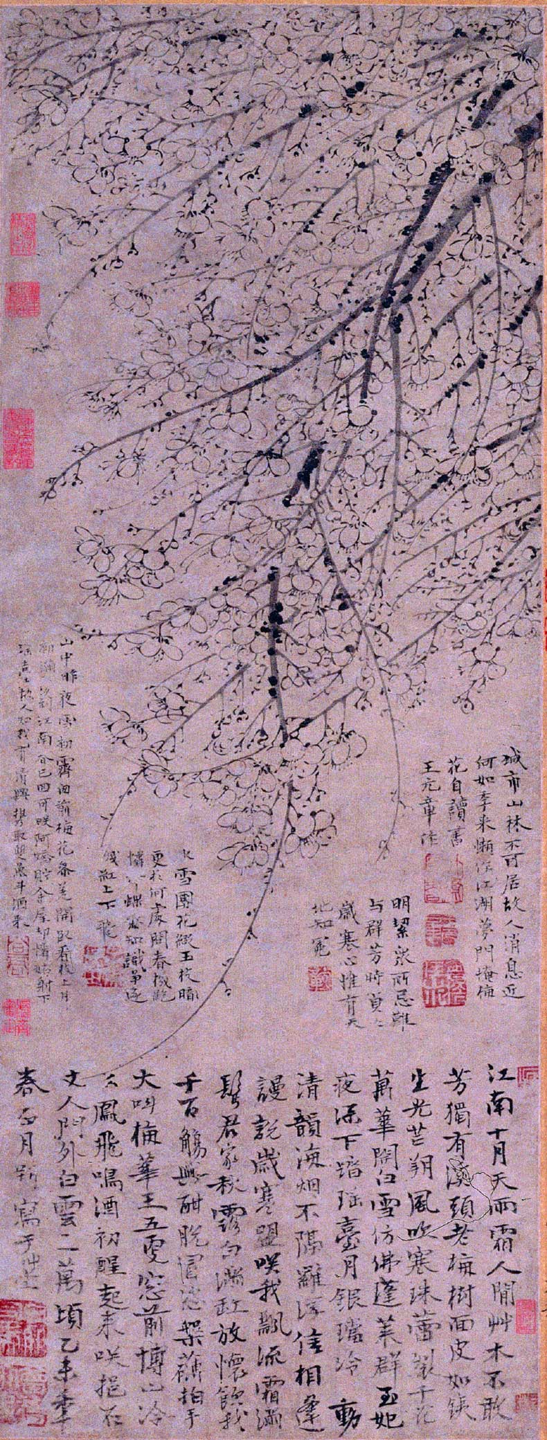 宋人塑造的梅花形象,往往以简洁的枝条和疏落的花朵,表达出孤冷清傲的意韵。而王冕却超脱前人的定式,别出心裁地以繁枝缀以万花。干枝郁密,交错穿插,几乎密不透风。梅花的分布则富有节奏韵律,长枝处疏,短枝处密,但密而有序,乱中有法。白洁的花朵和干枝相映,更显清气袭人。